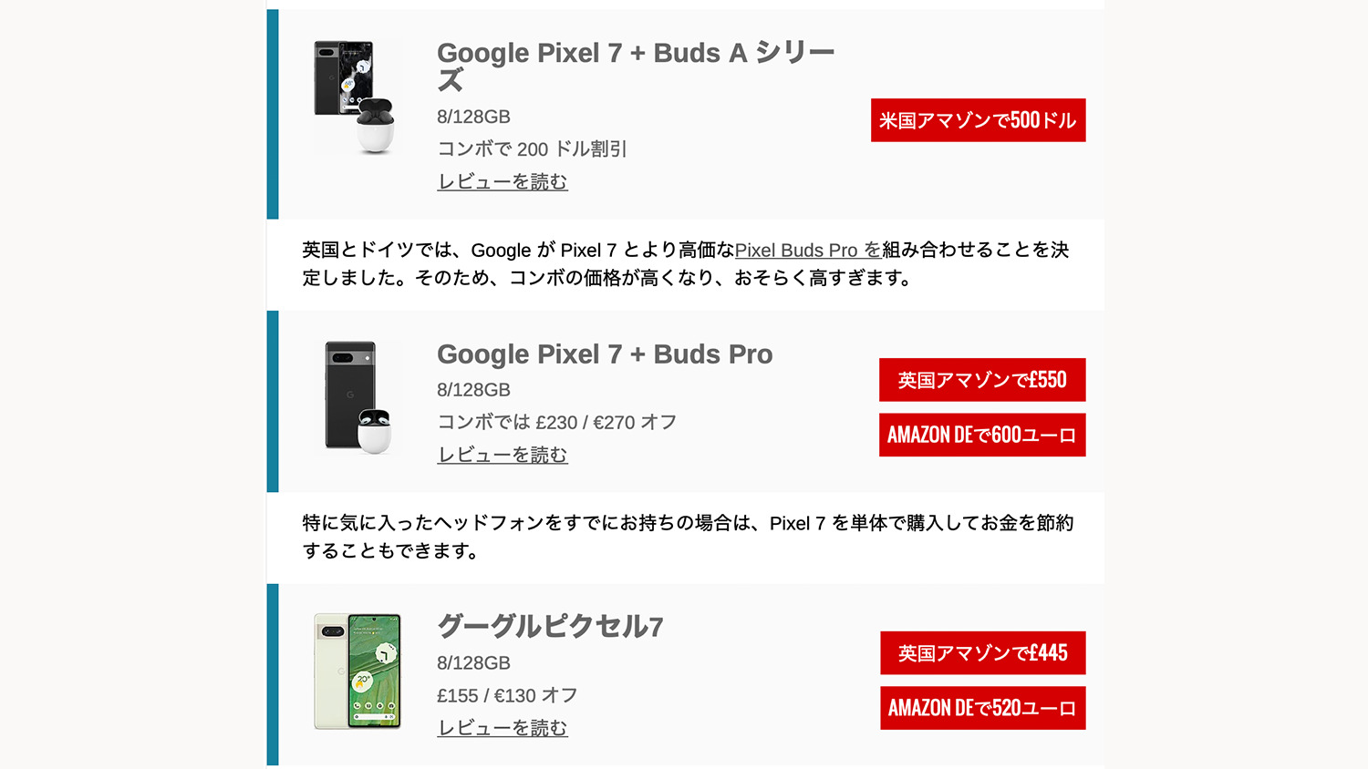 例えば上記の画像からも、アメリカではPixel 7とPixel Buds Proのバンドルセットが$200の割引。そしてイギリスでは£230の値引きと安売り。またイギリスとドイツに関してはPixel 7単体でも安くなっていることを確認することができます。