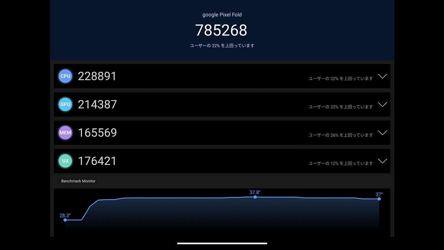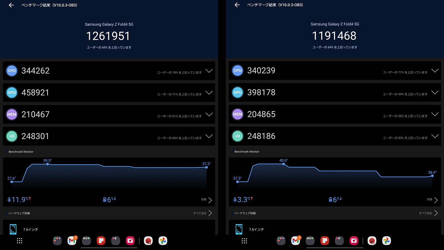スコアで見れば雲泥の差という感じですが気になるのは発熱の方で計測終了ごとに外部温度を計測してみましたがGalaxy Z Fold 4は40.1/41.1度に対してPixel Foldは35.4/34.7度。