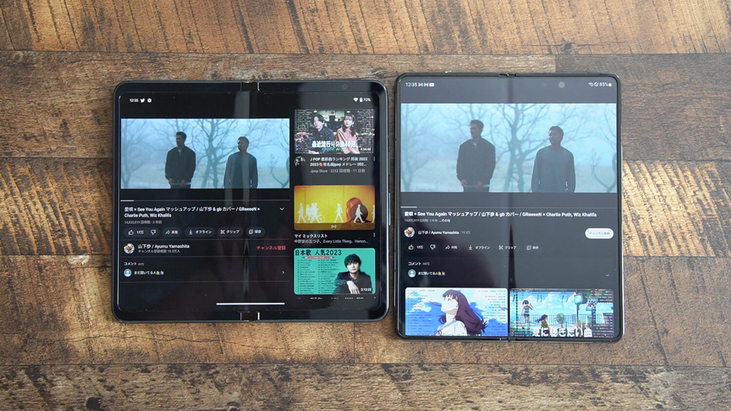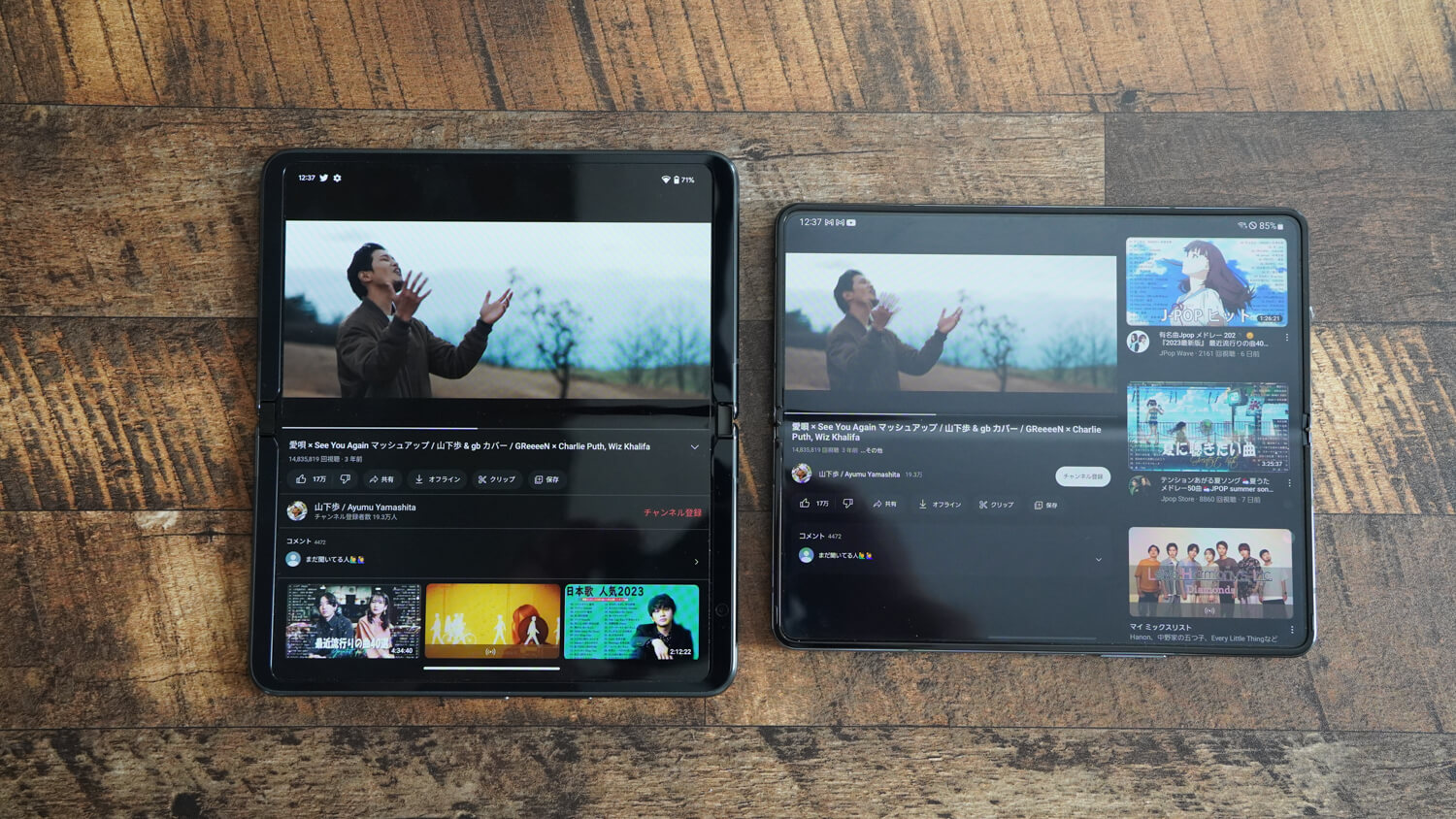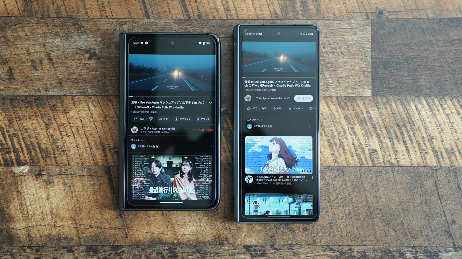 一応先ほどと同様にコンテンツを表示してみるとYouTubeにおいては関連動画など一度に表示できる情報量はGalaxy Z Fold 4の方が多いですがコンテンツ自体は圧倒的に小さい。