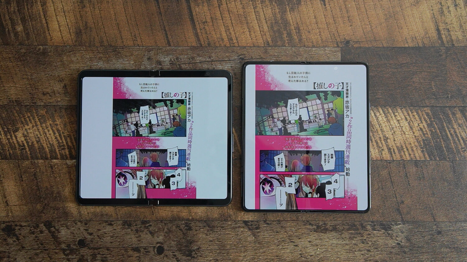次に少年ジャンプ+で漫画を開いてみましたが表示方法が大きく異なりPixel Foldは基本見開き表示でGalaxy Z Fold 4は一枚表示でより大きく見せるという感じです。