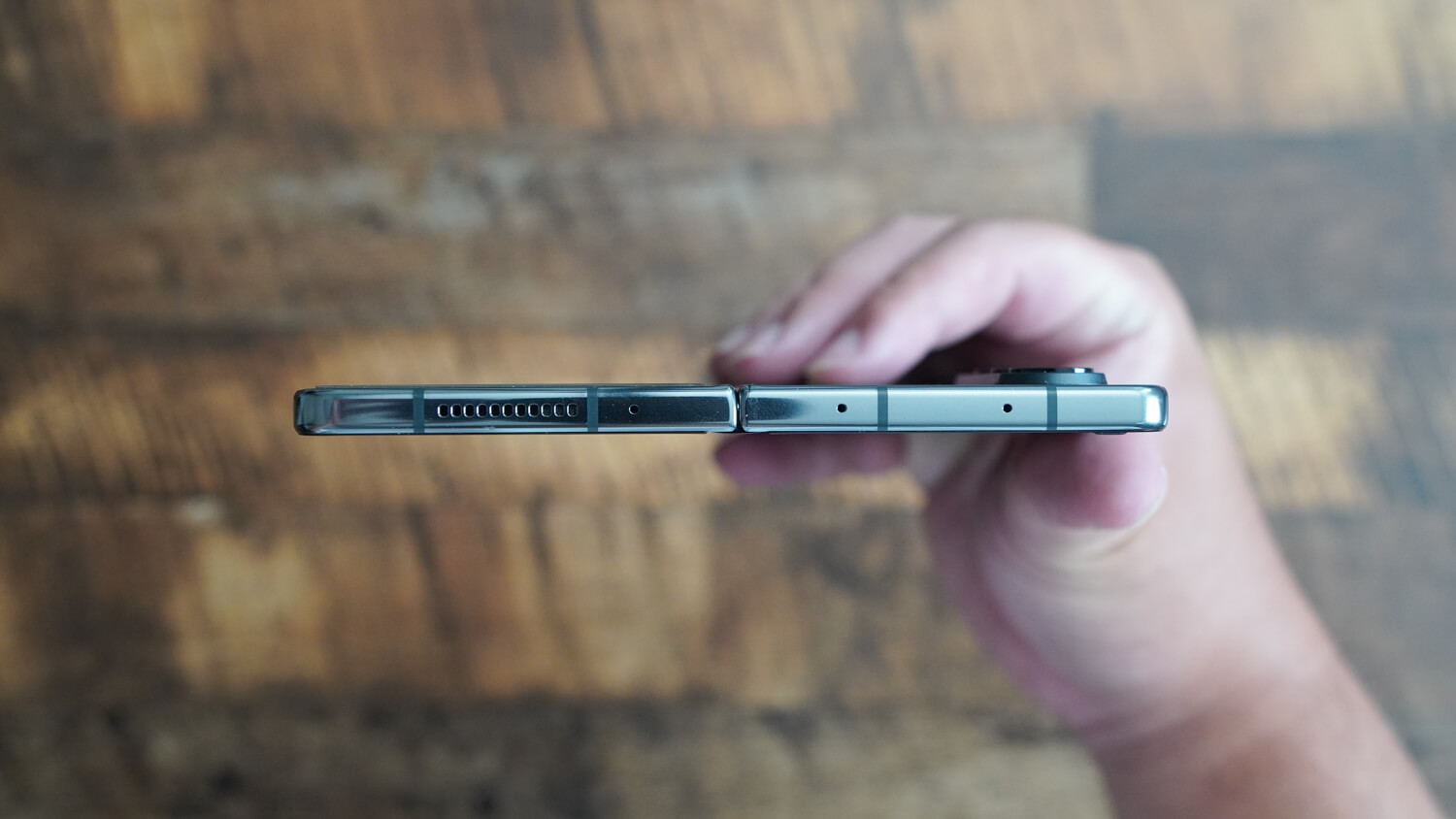 下部にはSIMトレイにUSB-CにスピーカーグリルとSIMトレイの位置がいつもと違う感じです。ヒンジ部分はアルミが採用されていることからも光沢仕上げとなっておりサイドフレームも質感を統一するためか軽く丸みを帯びた光沢仕上げと高級感を感じます。