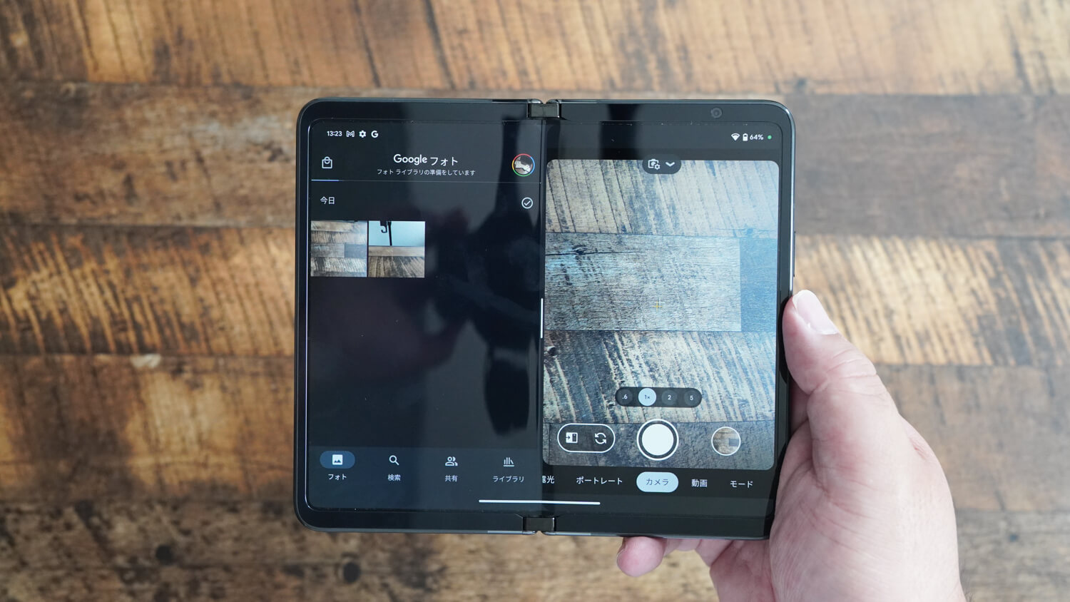 一方でPixel Foldはカメラアプリ自体は対応していないのでマルチタスクでGoogle Photoを開いて確認する流れで出来なくないけど最適化されている感じではないです。