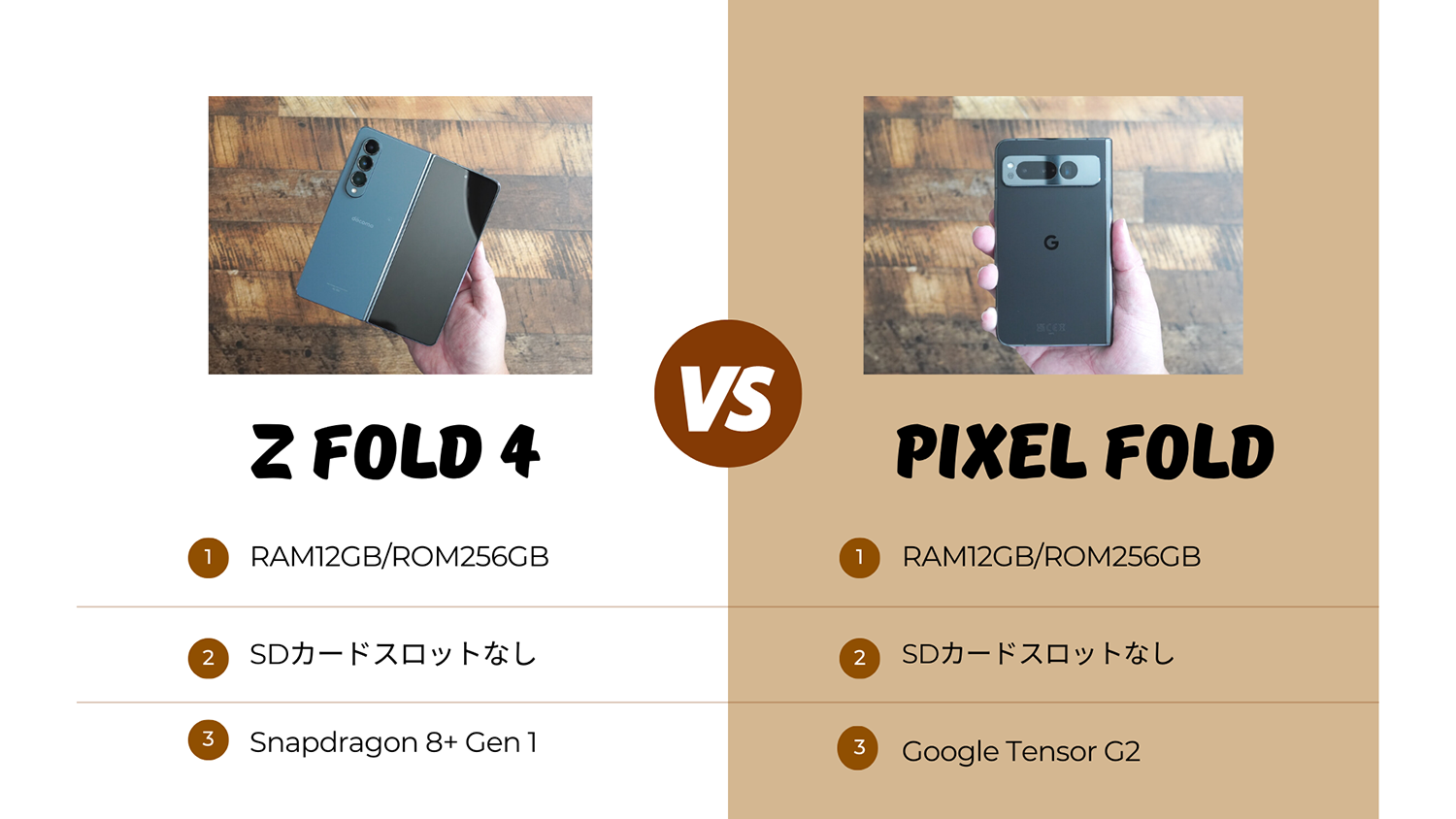 ライバル機種であるGalaxy Z Fold 4と比較するとGalaxy Z Fold 4は縦長に対してPixel Foldは横長とかなり印象が違い本体を持った時にPixel Foldの方が大きく感じます。