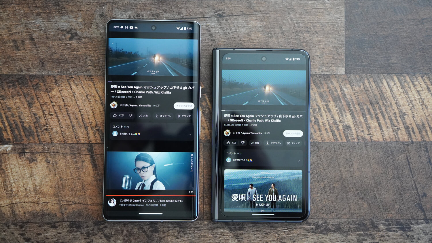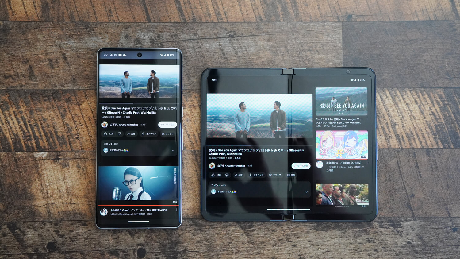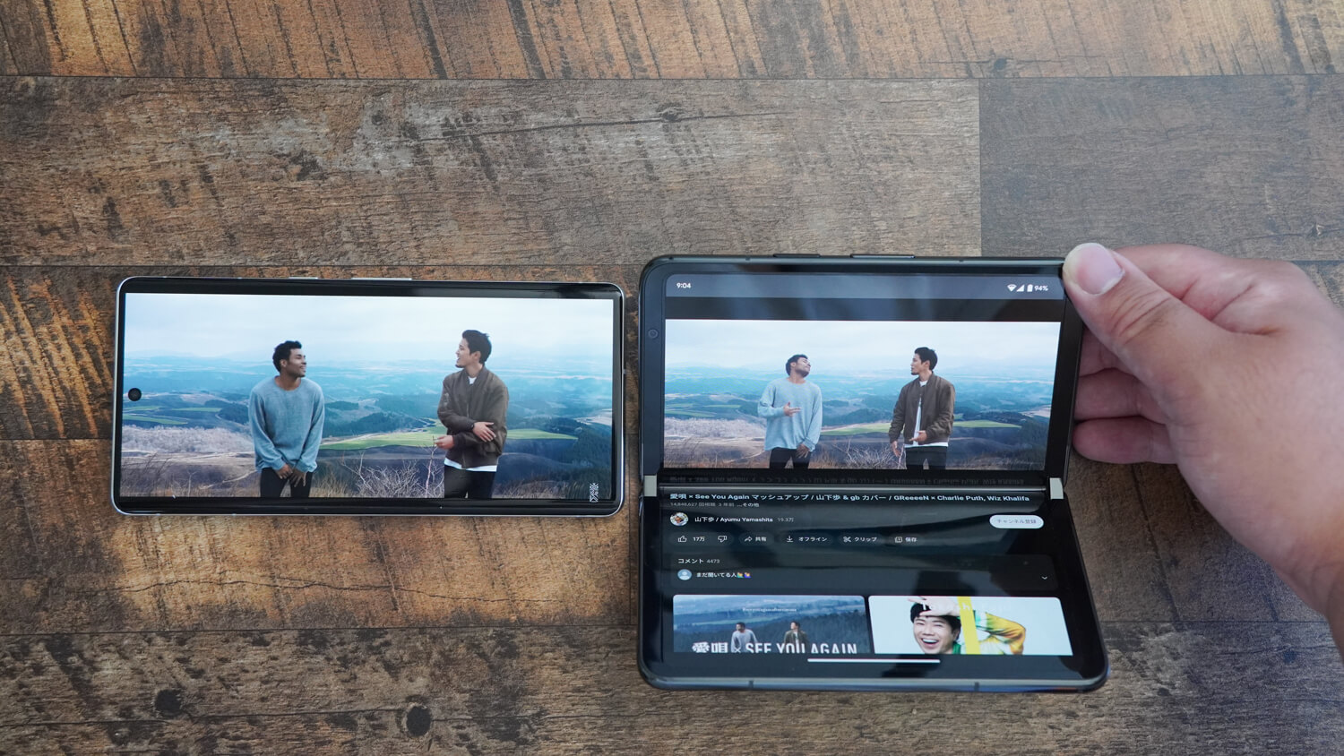 サブディスプレイで再生してみると横幅がPixel Foldの方があることからもPixel Foldが大きい。ただ縦幅短いため一度に表示できる情報量がちょっと少ないですがそこまで変わる感じではない。