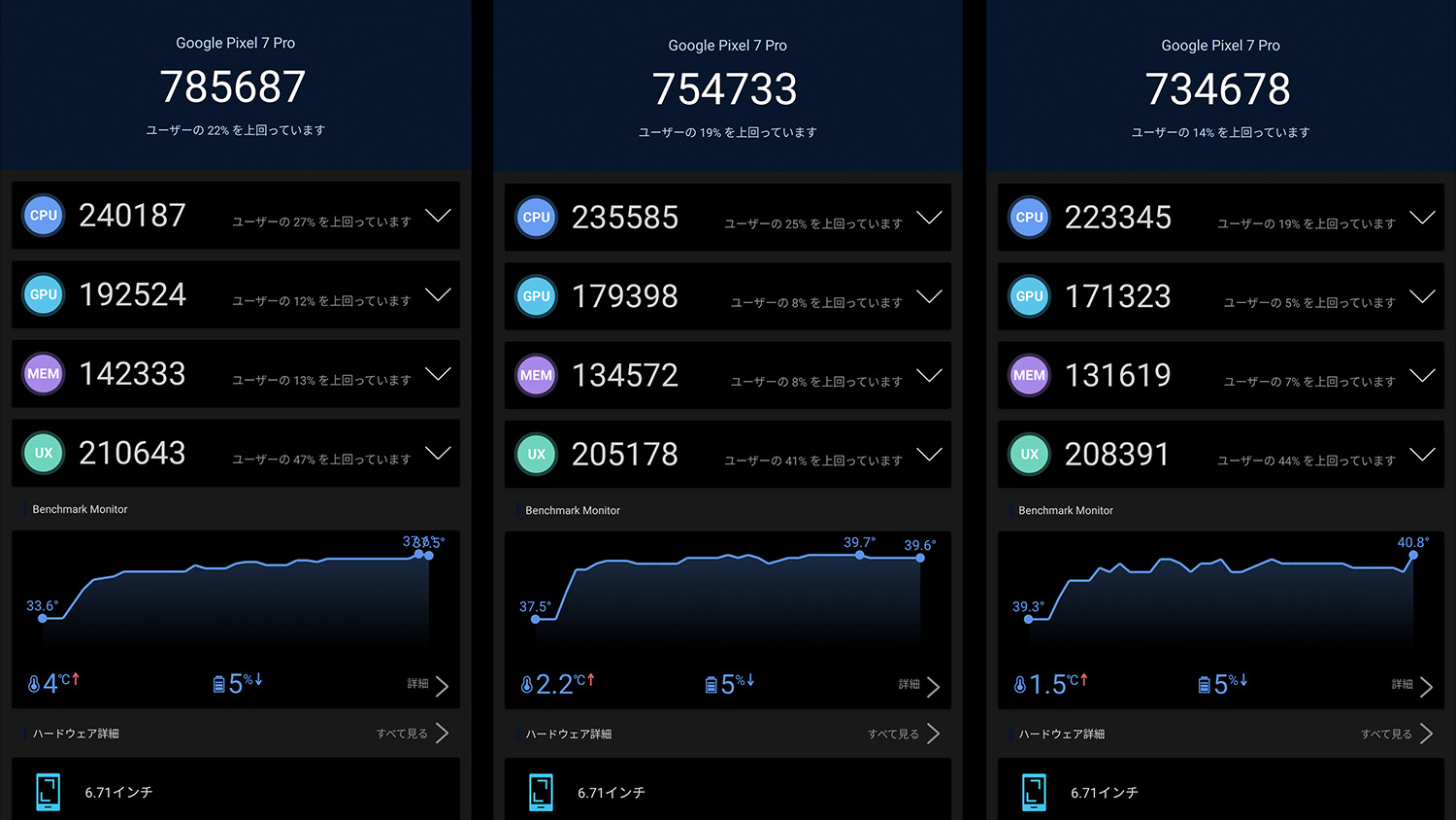 Pixel Foldの方が簡単に暖かくなりやすい一方で不快になるような熱さになりにくい印象。一方でPixel 7 Proは負荷をかけるまでは熱くなりにくい感じですが負荷をかけると正直不快に感じるほどの熱さになるという感じでユーザーにとって評価が分かれると思います。