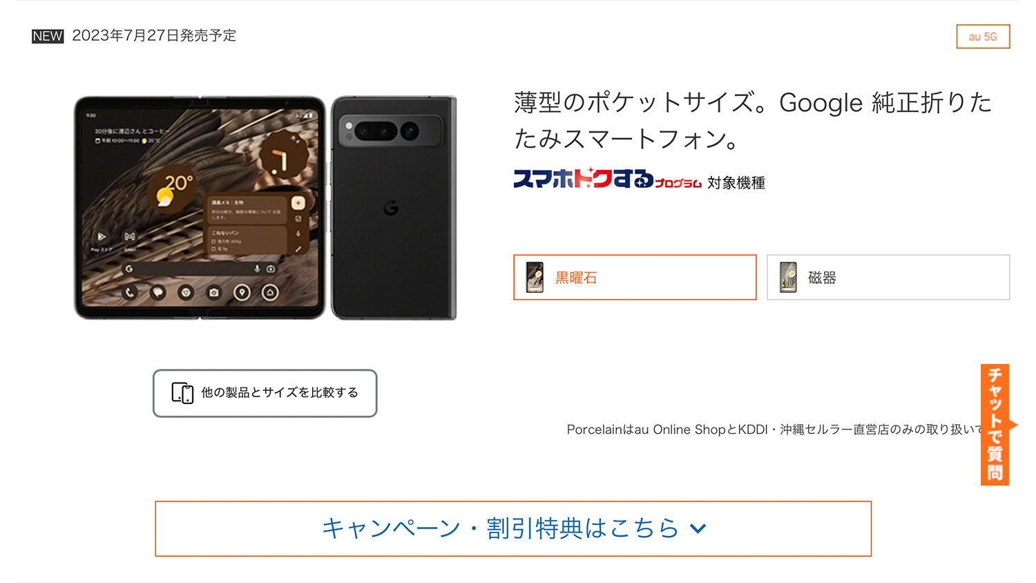 KDDI、沖縄セルラーは2023年7月27日にauから、5G対応スマートフォン「Google Pixel Fold」を国内通信事業者最速で発売します。なお「Google Pixel Fold」のPorcelain(白)は、国内の通信事業者としてはauのみが取り扱います