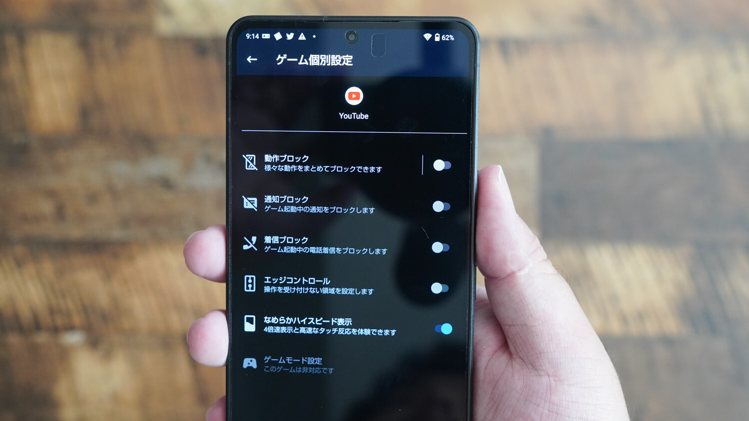 設定からなめらかハイスピード表示及びゲーミングメニューの登録ゲーム設定をオンにしたアプリでは120Hz表示に加えて黒のフレームを挟むことで実質240Hz表示に対応している感じ。