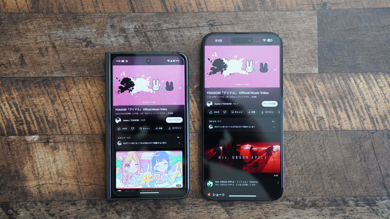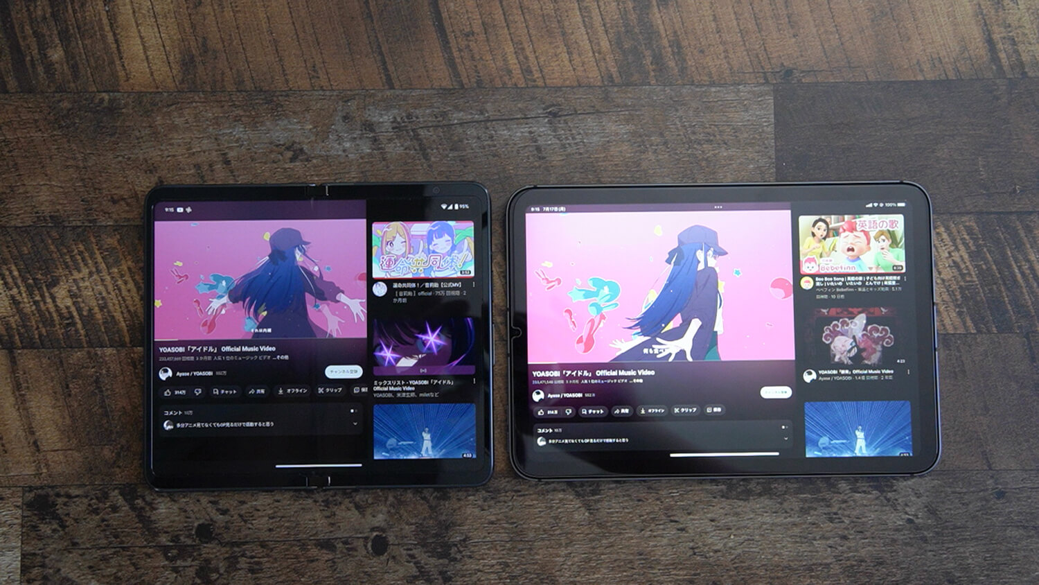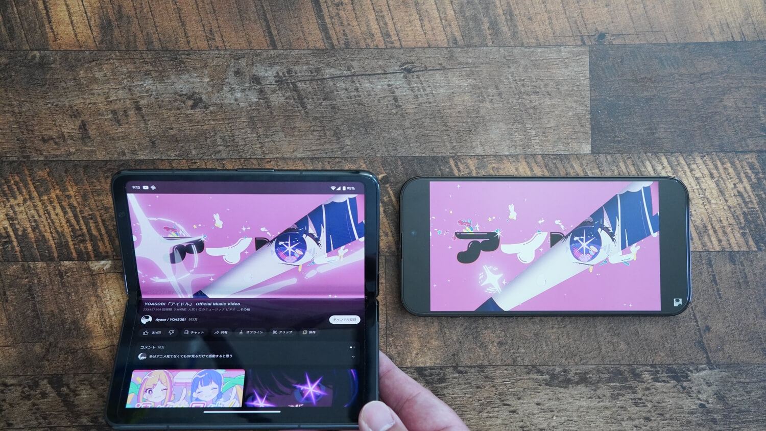 そしてYouTubeを再生してみるとPixel Foldの方が横幅あるためコンテンツ自体はほぼ一緒。ただ縦幅に大きな違いがあることからもPixel Foldの方が関連動画などの情報が少ない。