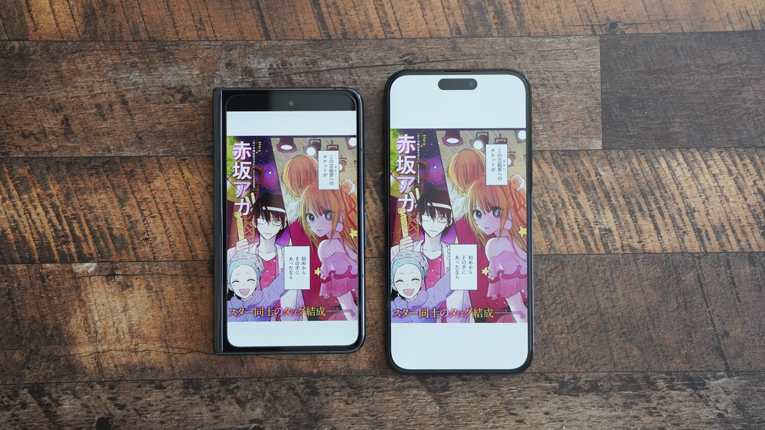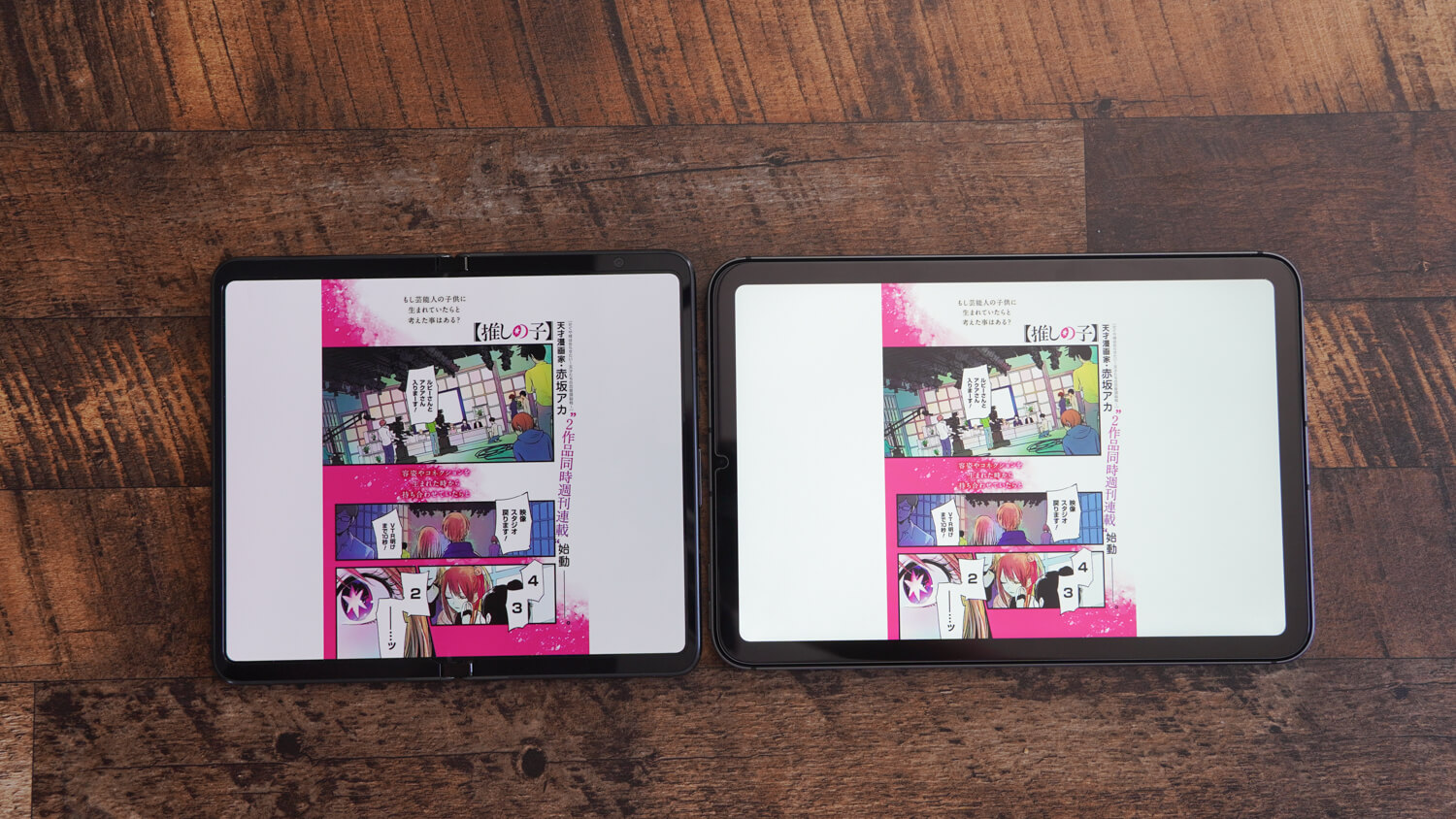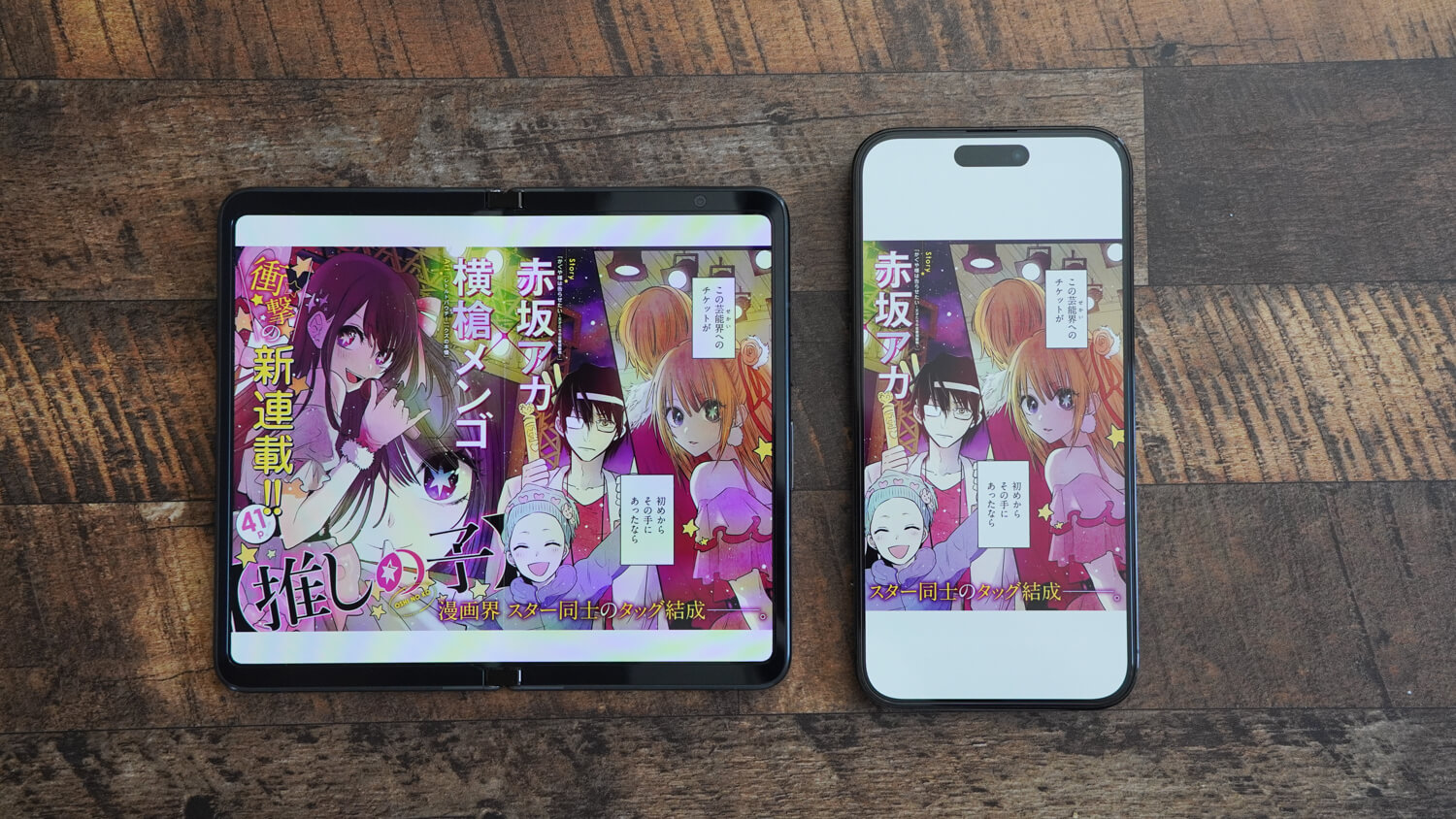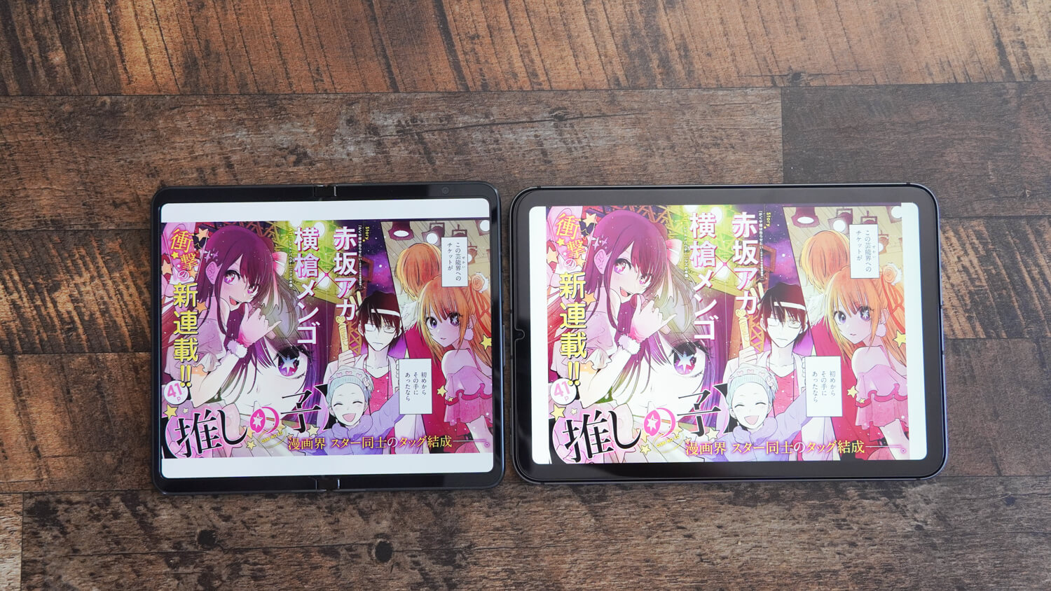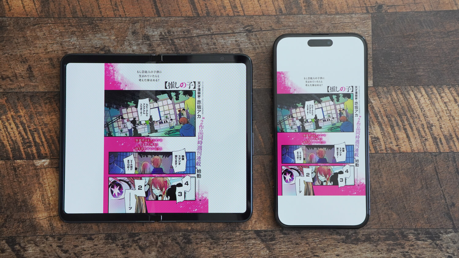 またPixel Foldは基本見開き表示になりますが1ページあたりの大きさも同じくらいです。そのため漫画においてもやはりPixel Foldの方が圧倒的に見やすいかなという印象です。