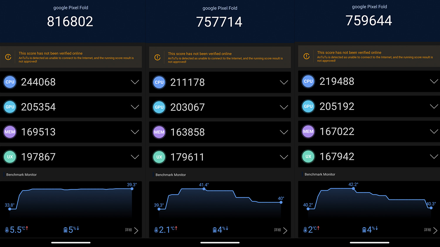 個人的な印象としてはiPhone 14 Pro Maxの方がかなり熱いと感じるシーンがありますが基本よほど負荷をかけない限りは大丈夫で逆にPixel Foldは常に暖かいという感じです。