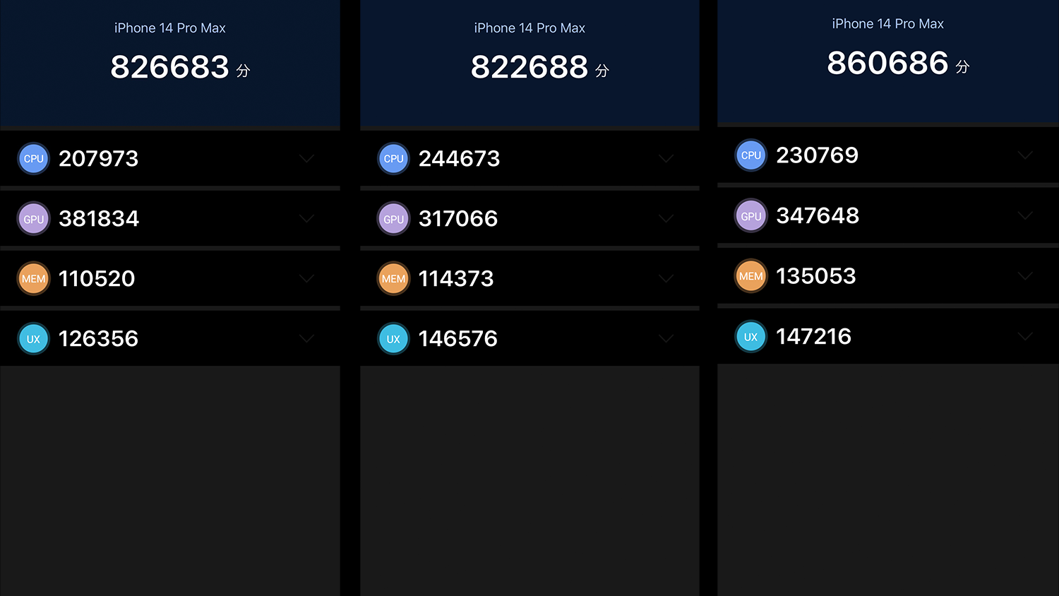 ただiPad miniと比較するとiPhone 14 Pro Maxとの差ほど大きな差があるわけではない。3つ目として発熱の程度を調べるためにベンチマークを3回連続で回してみました。