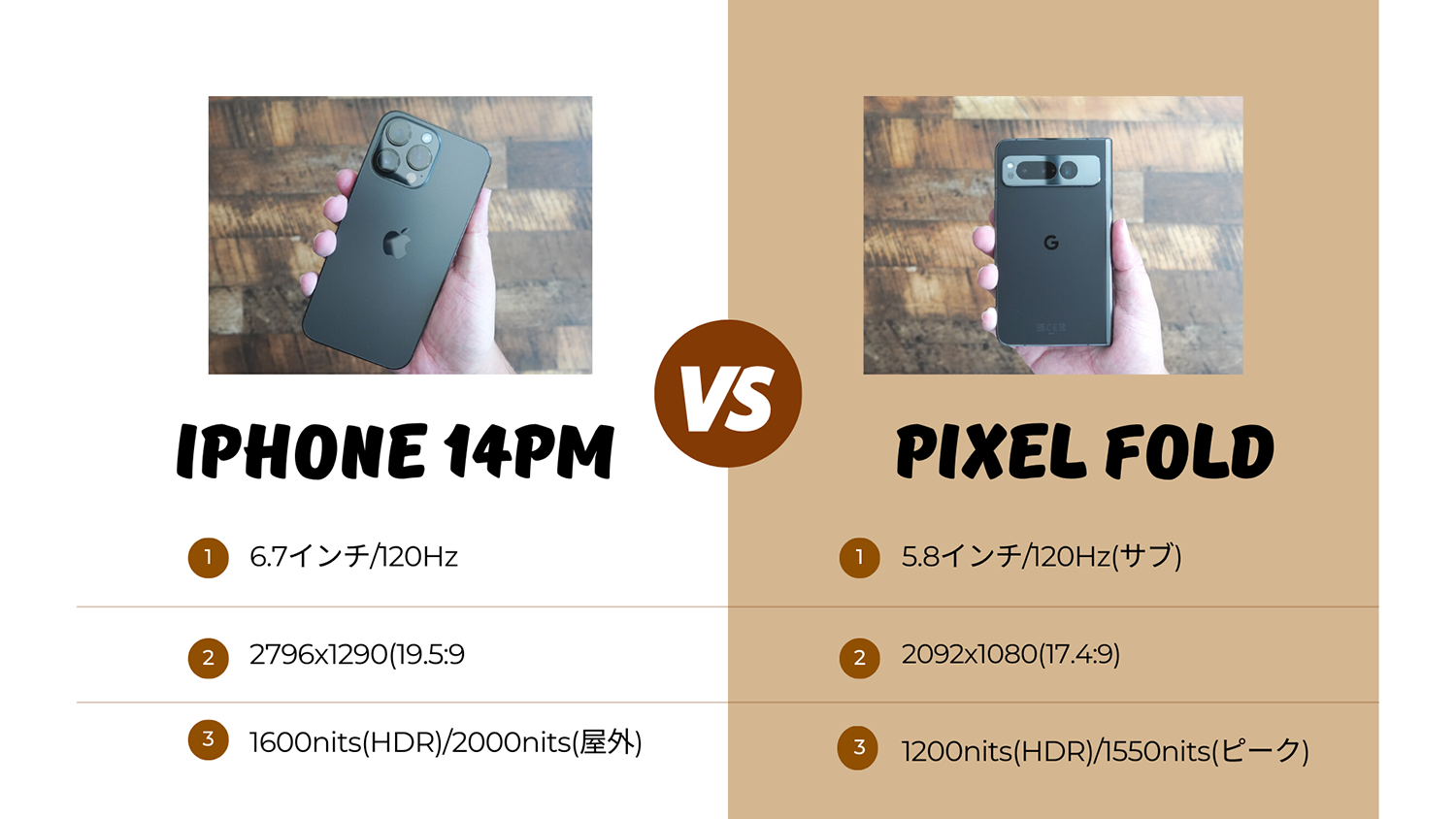 ちなみに画素密度でみるとiPhone 14 Pro Maxが460ppiでPixel Foldは408ppiと僅かにiPhone 14 Pro Maxの方が高いですが肉眼で識別できるような差があるわけではない。
