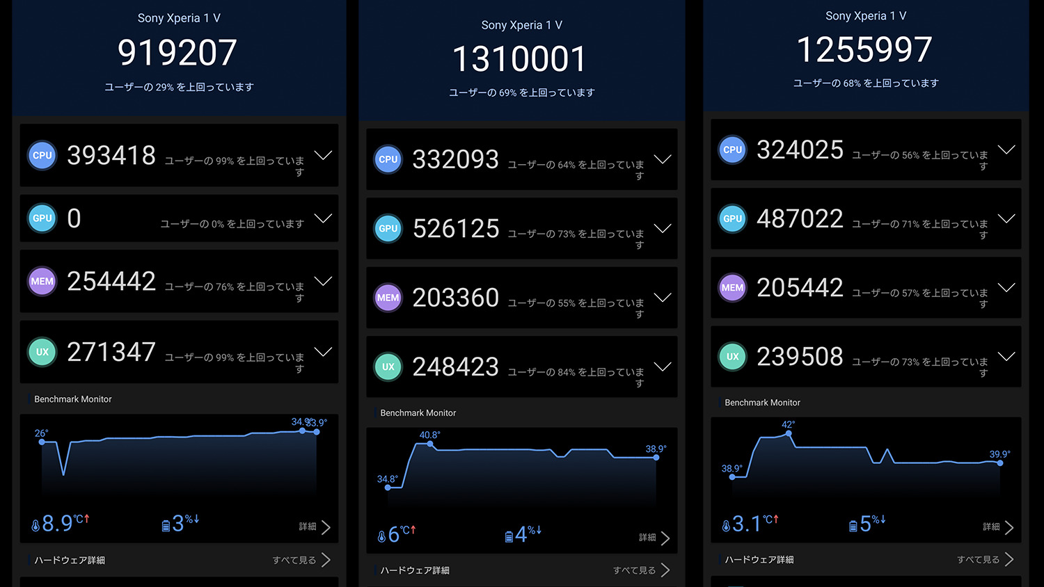 そしてXperia 1Ⅴはなぜか1回目の計測がRAM8GB以下の機種のようにGPUテストが失敗しました。