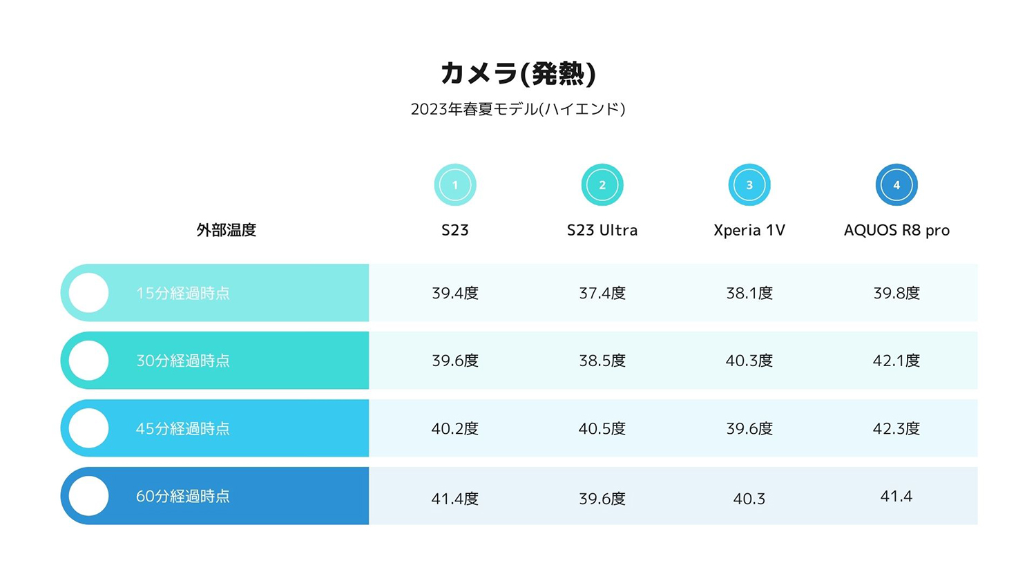 そしてGalaxy S23は発熱はしやすいけど安定しておりXperia 1Ⅴも意外とひどくはない。一方でAQUOS R8 proはベンチマークとカメラでは真逆の結果なのでちょっと興味深いです。