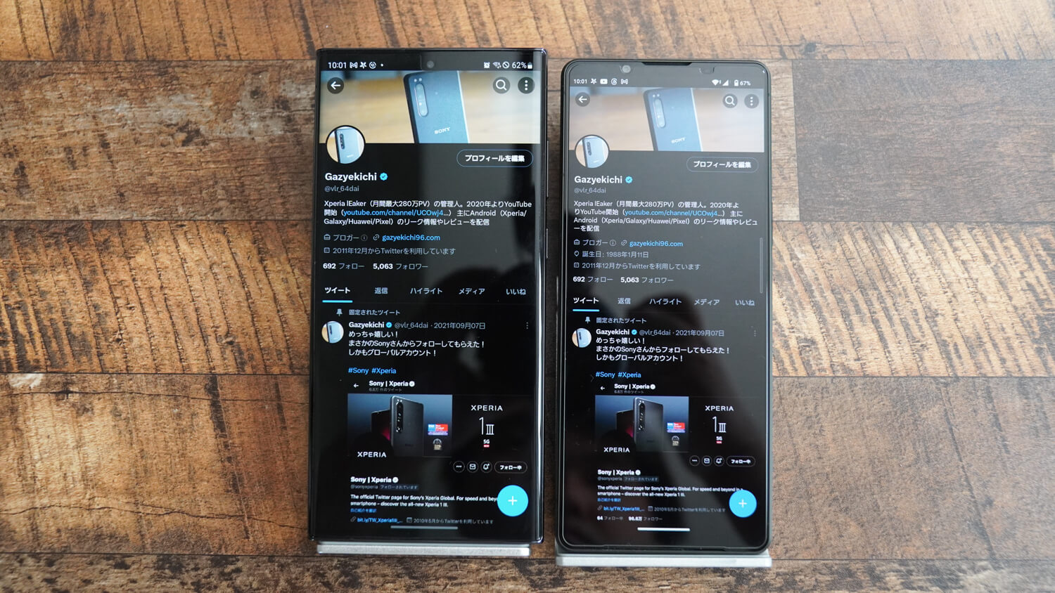 Xperia 1Ⅴは縦長のため一度に表示できる情報量が多めですがディスプレイサイズの差からもGalaxy S23 Ultraとほとんど一緒という感じ。単純にGalaxy S23 Ultraの方が横幅もあるためコンテンツも大きめに表示され見やすいです。