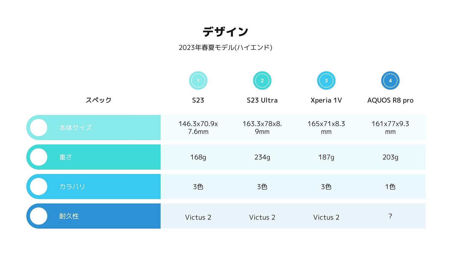 今年の夏モデルの中でキャリアから発売されているハイエンドモデルはGalaxy S23/Xperia 1Ⅴ/Galaxy S23 Ultra/AQUOS R8 proで今回はこの4機種に絞ってざっくりと比較とします。