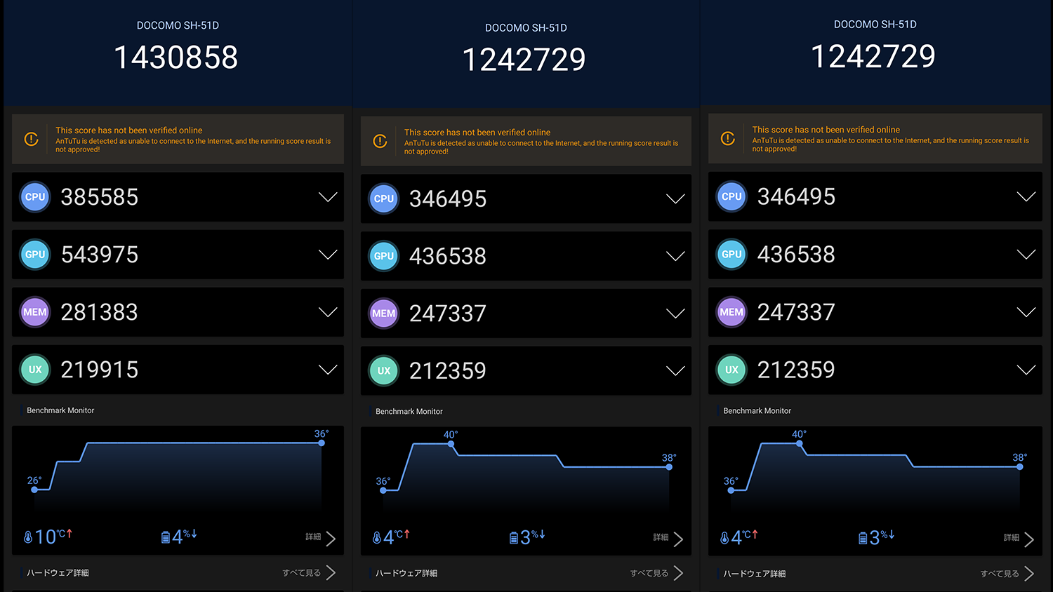そのため原神などのプレイテストでスコアが最も低いという結果につながっている可能性も。一方でAQUOS R8 proは内部温度が40度起点にスロットルダウンをかけて安定している感じ。