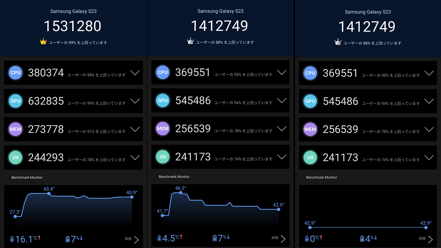 ただベンチマークと違う外部温度ではAQUOS R8 proが最も高くかなり不快な熱さになります。両テストにおいてGalaxy S23 Ultraは安定している印象で不快な熱さにはなりにくい。
