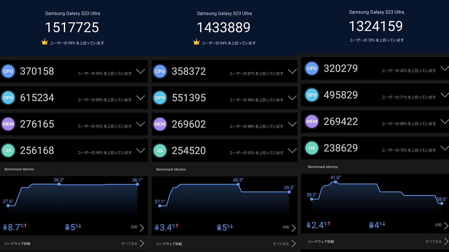 逆に電池持ちがいいと言われているGalaxy S23 Ultraはどちらでも安定している印象です。
