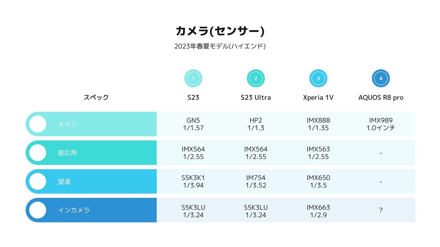 メインカメラセンサーで見るとAQUOS R8 proが最も大きくGalaxy S23が最も小さいです。改めて他の機種と比較すると思うのがXperia 1Ⅳの時に望遠が豆粒センサーと批判されましたが今回比較した機種の中では僅かですが一番大きいので逆にGalaxy S23シリーズの望遠がすごい。