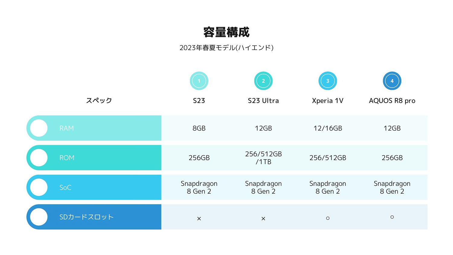 容量構成を確認するとGalaxy S23のみRAM8GBですが多くのユーザーには十分な容量。少なくともAndroidが最低限動くにはRAM6GBと言われているので最低限は満たしています。