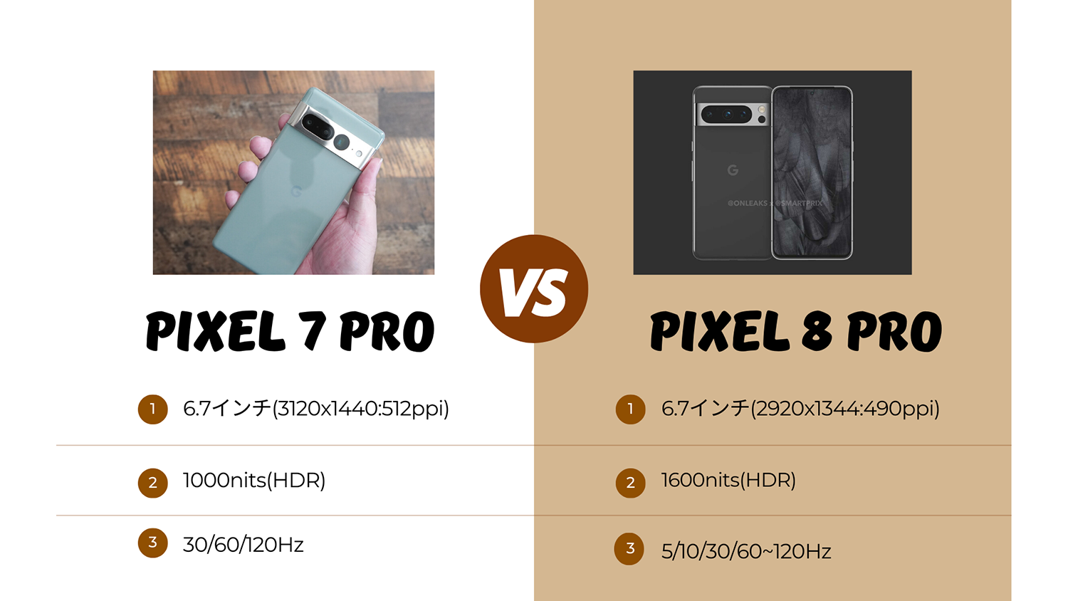 採用されるディスプレイ自体が変更されるのか不明ですが大きく進化するポイントとして一つ目としてはディスプレイ輝度です。現行モデルはHDR表示の場合は最大で1000nitsで海外サイトによるとPixel 8 ProはHDR表示で最大1600nitsまで強化されるとの予測。