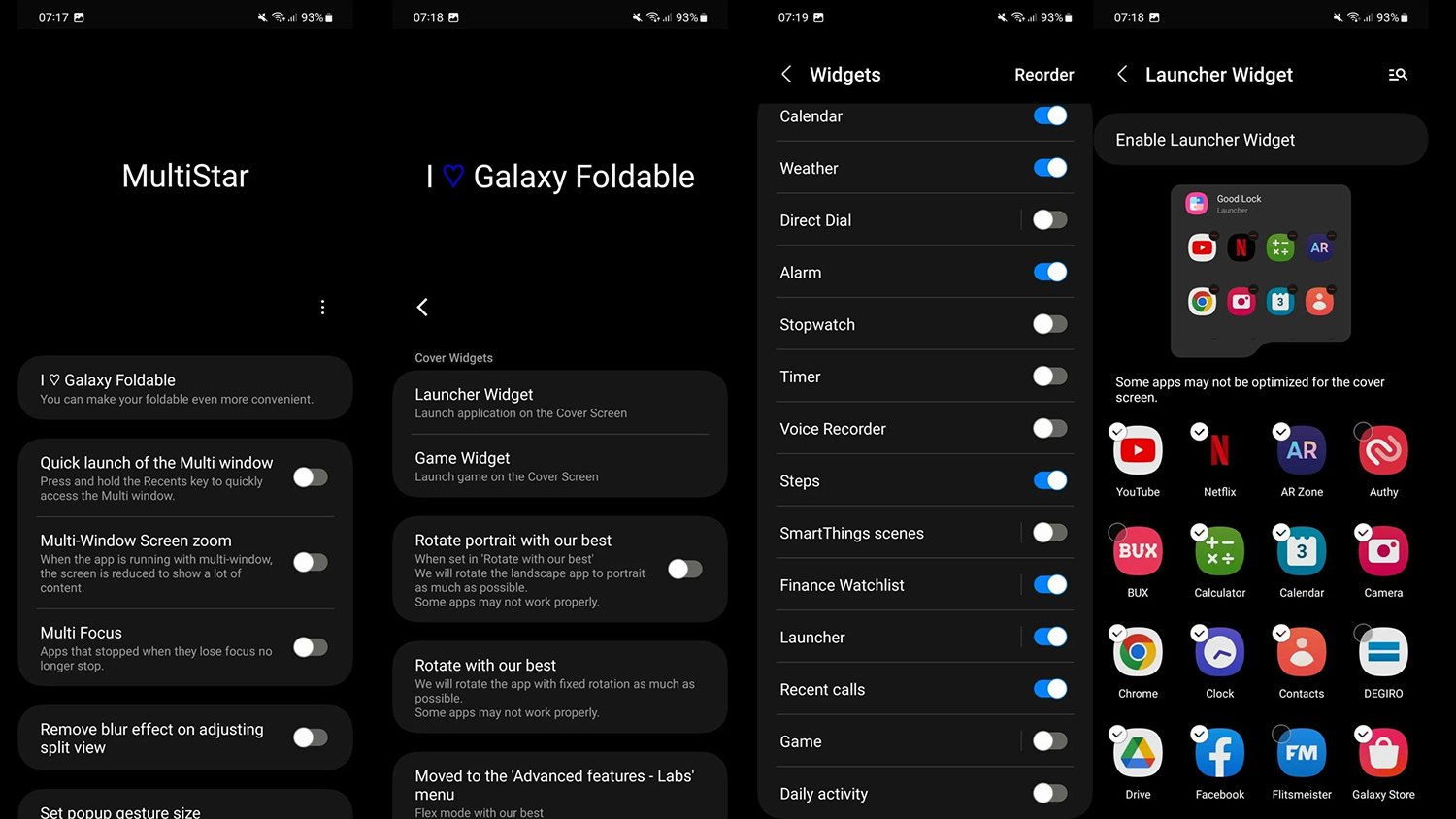 - 次に、「I ♡ Galaxy Foldable」をタップし、続いて「Launcher Widget」をタップし、「Enable Launcher Widget」ボタンをタップして、最後に「戻る」ボタンを押して前の画面に戻ります。