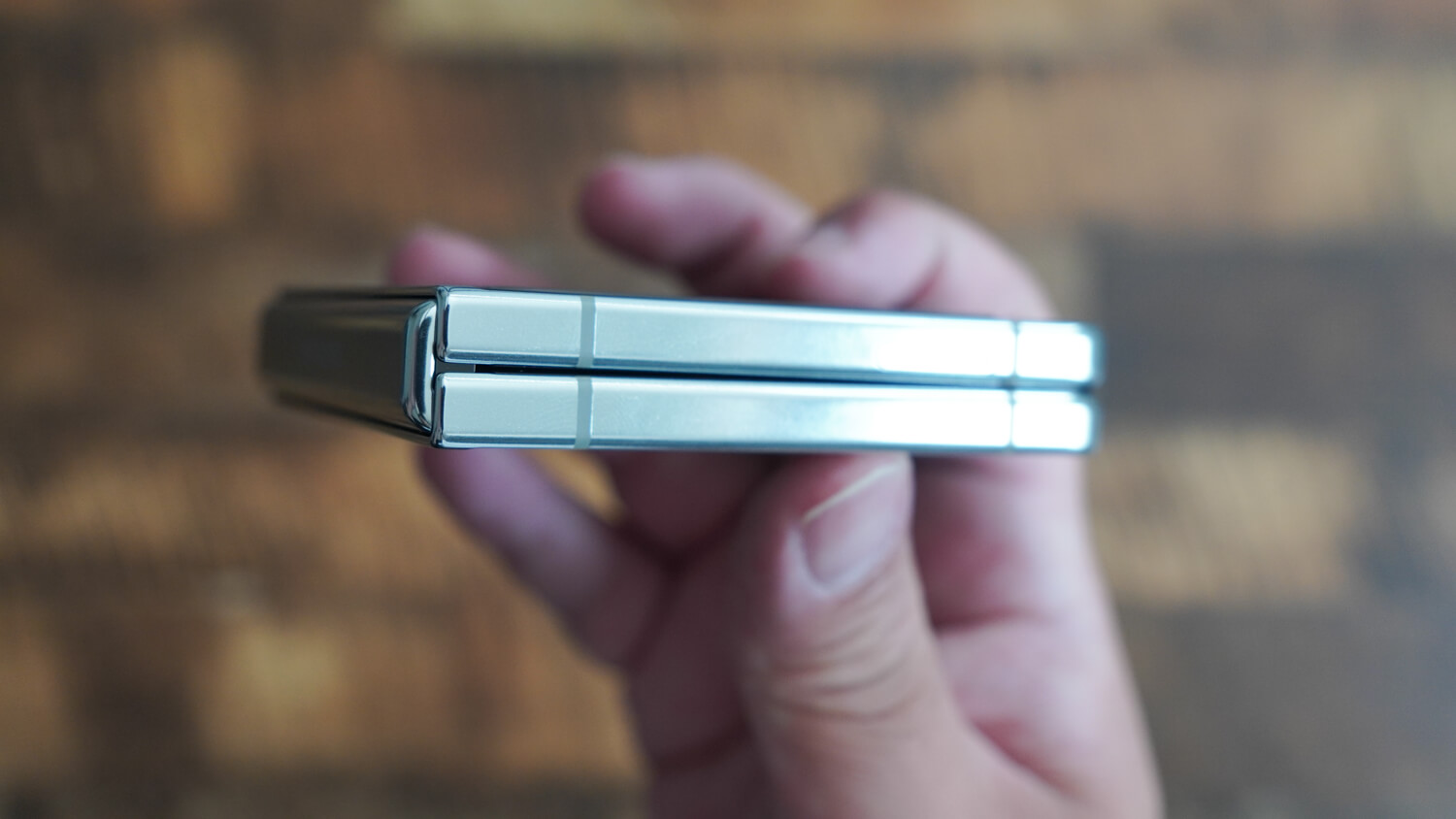 折畳式機種のメインディスプレイはデリケートなので余計なゴミはくっつけたくないですが構造的に厳しかったのが改善。ちなみに折り畳んだ状態でも厚みは最大で15mmもあるので他社と比較すると分厚いことに違いはなく前モデルがあまりにも分厚すぎたという感じです。