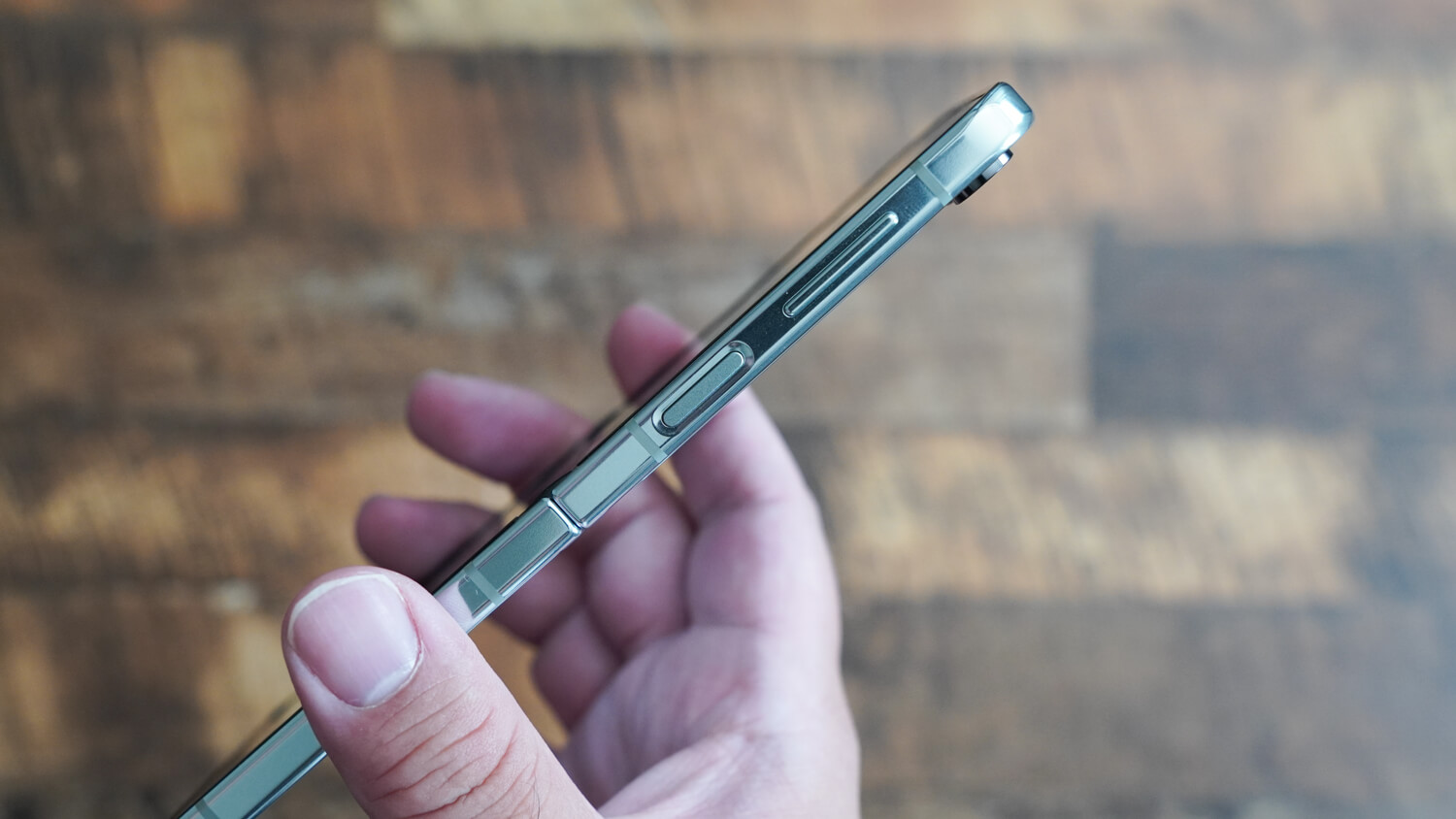 初めてGalaxy Z Flipを購入しましたが構造上仕方ないとはいえ物理ボタンが本体上部に集中。そのため他の機種と比較すると特に音量ボタンの位置がちょっと高いかなという印象です。