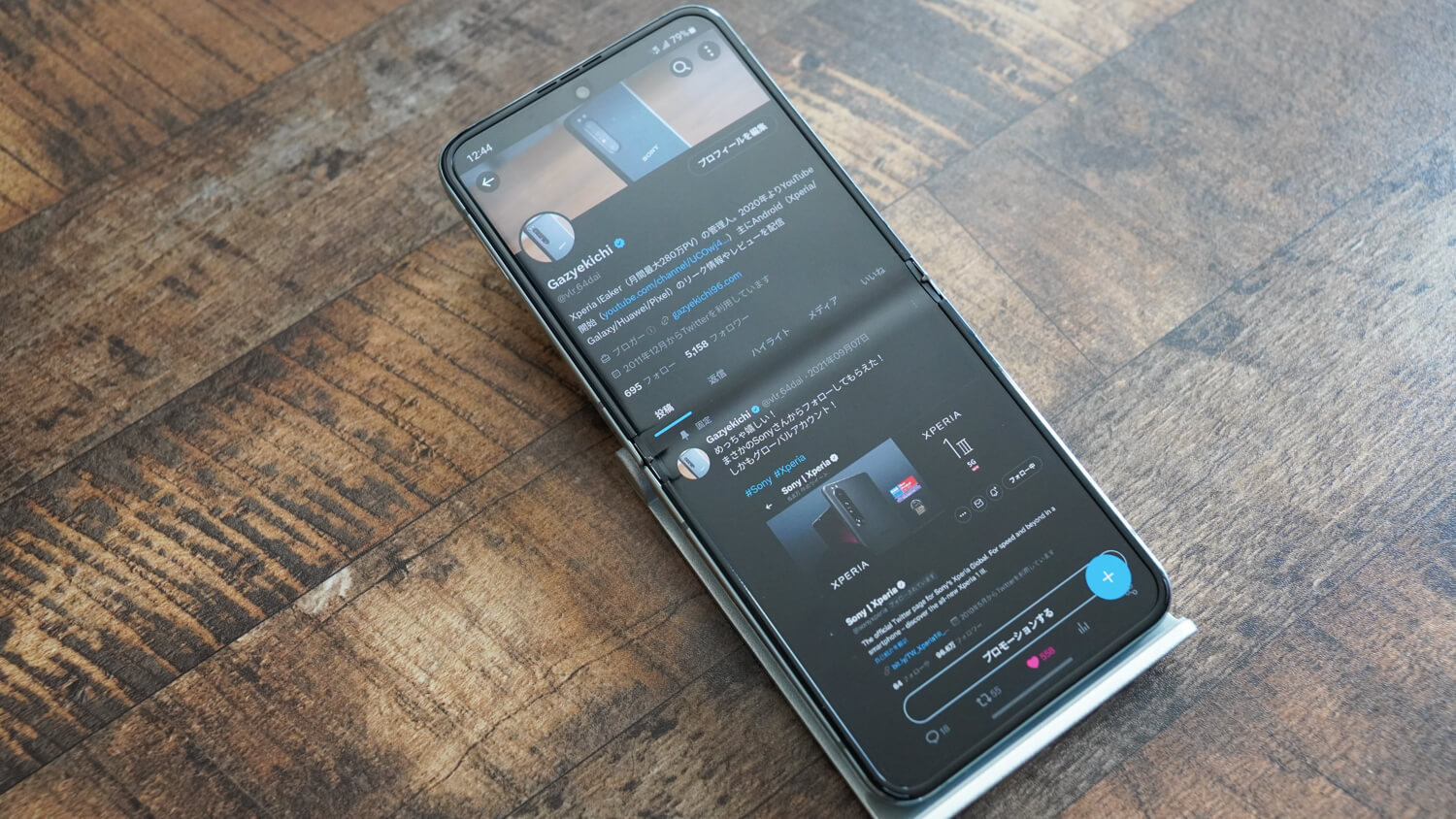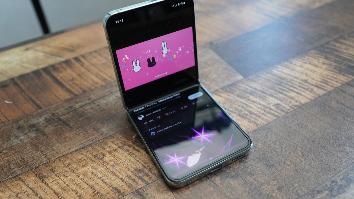 そしてフレックスモードを確認するとGalaxy Z Foldシリーズと異なり縦置きが前提で一応YouTubeを再生してみると上半分に動画が表示されて下半分に概要欄などが表示されています。