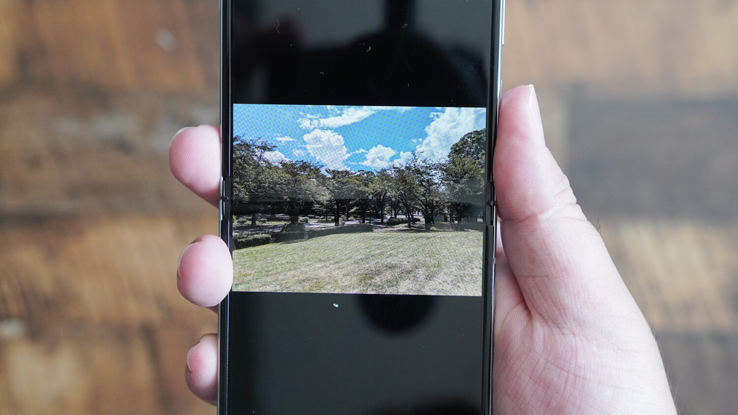 一方でカメラにおいてもフレックスモードで最適化されており下半分でシャッターボタンが表示。やはりGalaxy Z Foldのように撮影後の写真を同時に表示するような使い方は非対応。