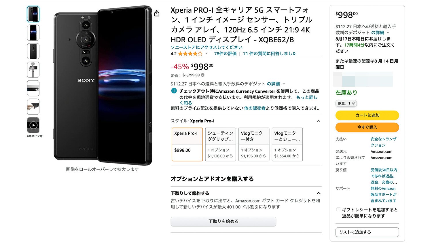 今回の情報によると米AmazonでXperia PRO-Iが大幅値引きされていることが判明したとしています。上記の画像からも45%の値引きで$998であることを確認することができます。