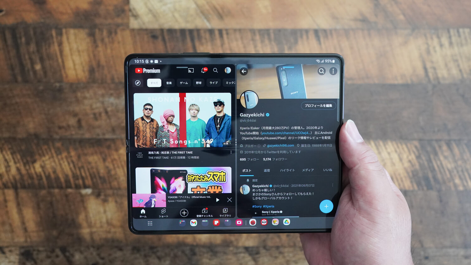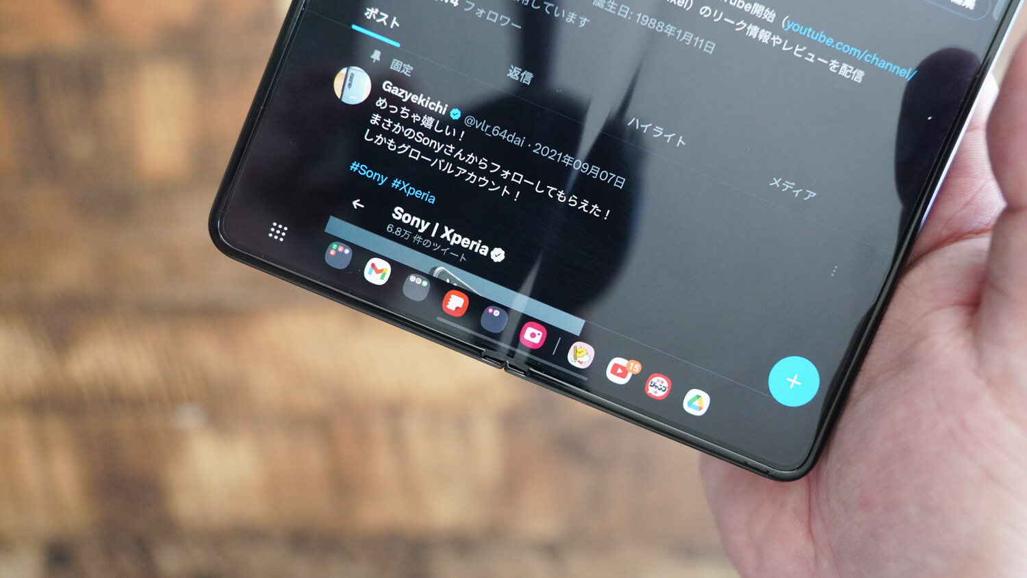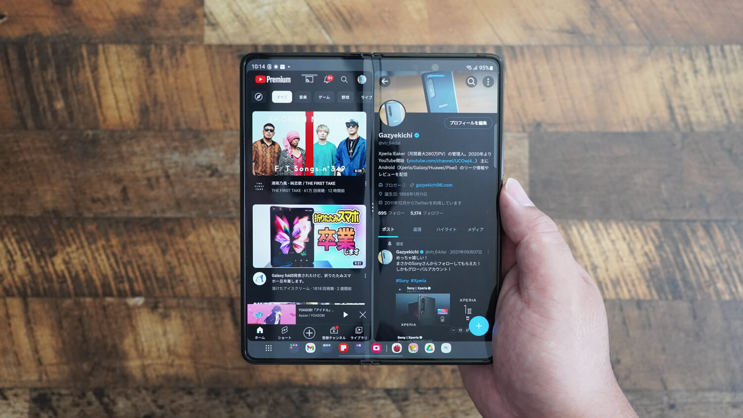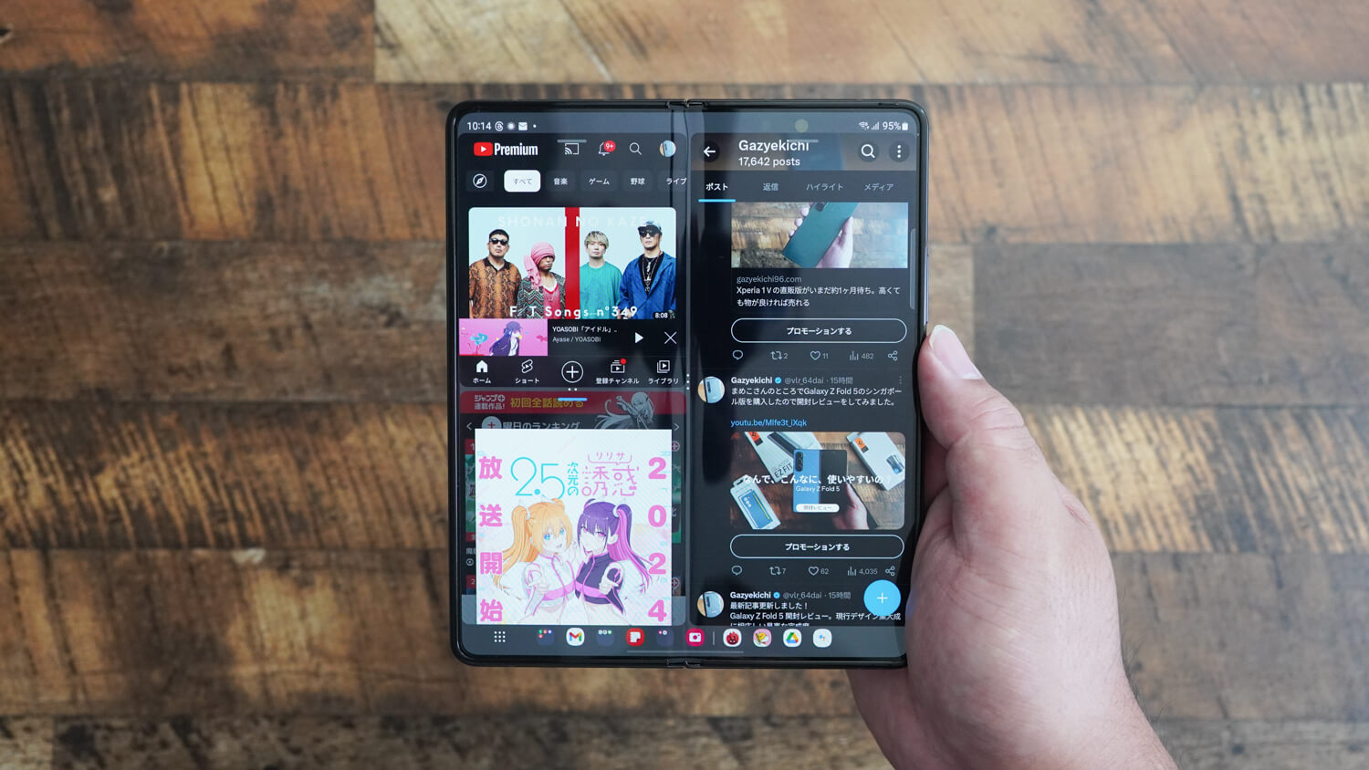 ちなみにサイズ感は流石に及びませんがGalaxy Z Fold 5はフレックスモードを使うことで画面を上下に分割してコンテンツを楽しみことができスタンド要らずで使えるのが便利です。