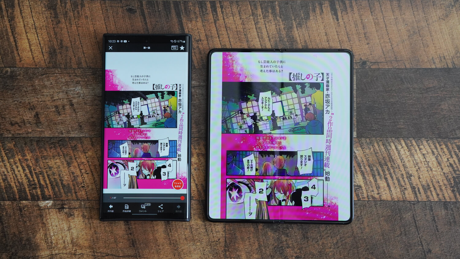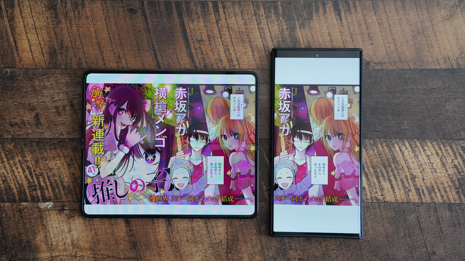 ただGalaxy Z Fold 5の本体を横向きにすることでコンテンツはさらに大きく表示が可能です。漫画にしろ動画にしろ基本当たり前と言えば当たり前ですがGalaxy Z Fold 5の方が大きいです。