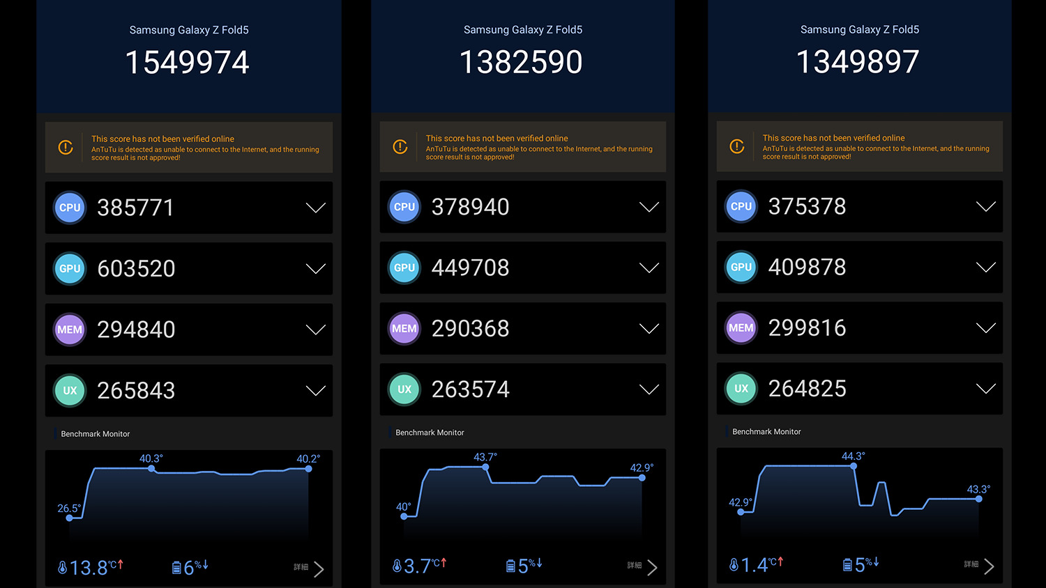 とりあえず発熱の程度を調べるためにベンチマークを3回連続で回してみました。最高スコアでみるとGalaxy Z Fold 5の方が高かったのは意外でしたが僅かな差に過ぎない。