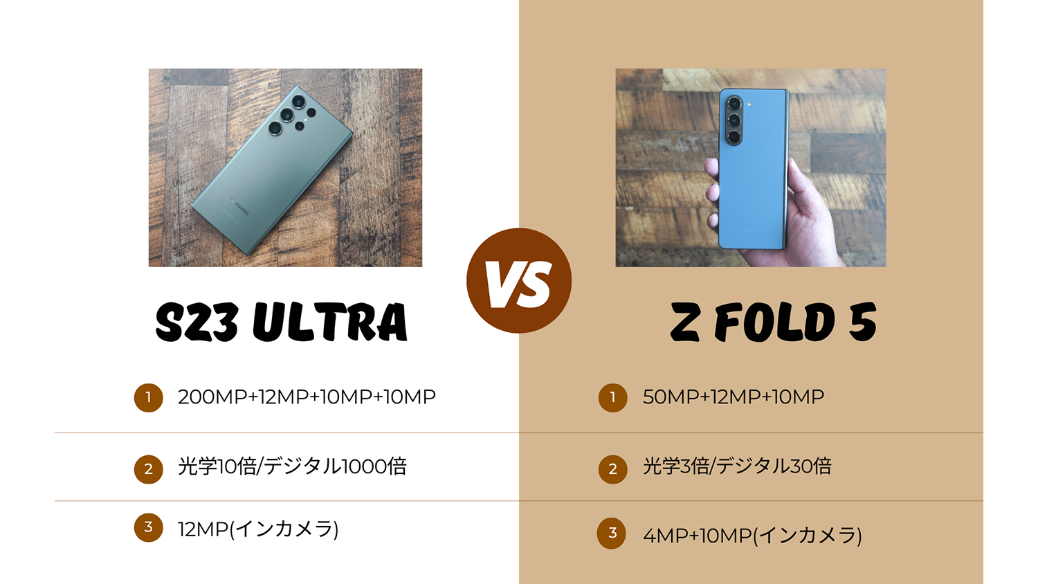 次にスペックで大きな差に繋がっているのがカメラでGalaxy Z Fold 5は単純に不利です。比較対象がGalaxy S23になってくればまた変わってきますがUltra相手だとかなり厳しいです。