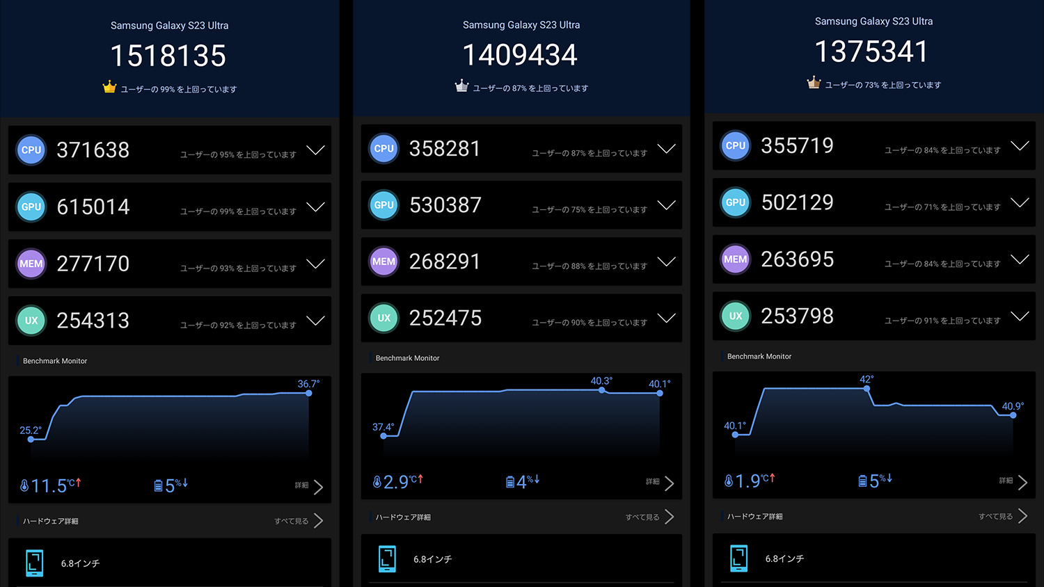 今回は本体を閉じていることもあり放熱性が悪く内部温度もかなり上がっている印象を受けます。ちなみに計測終了のタイミングで外部温度を計測しましたがGalaxy Z Fold 5は40.4/43.5/45.5度に対してGalaxy S23 Ultraは36.3/40.7/42.1度とかなりの差がある。
