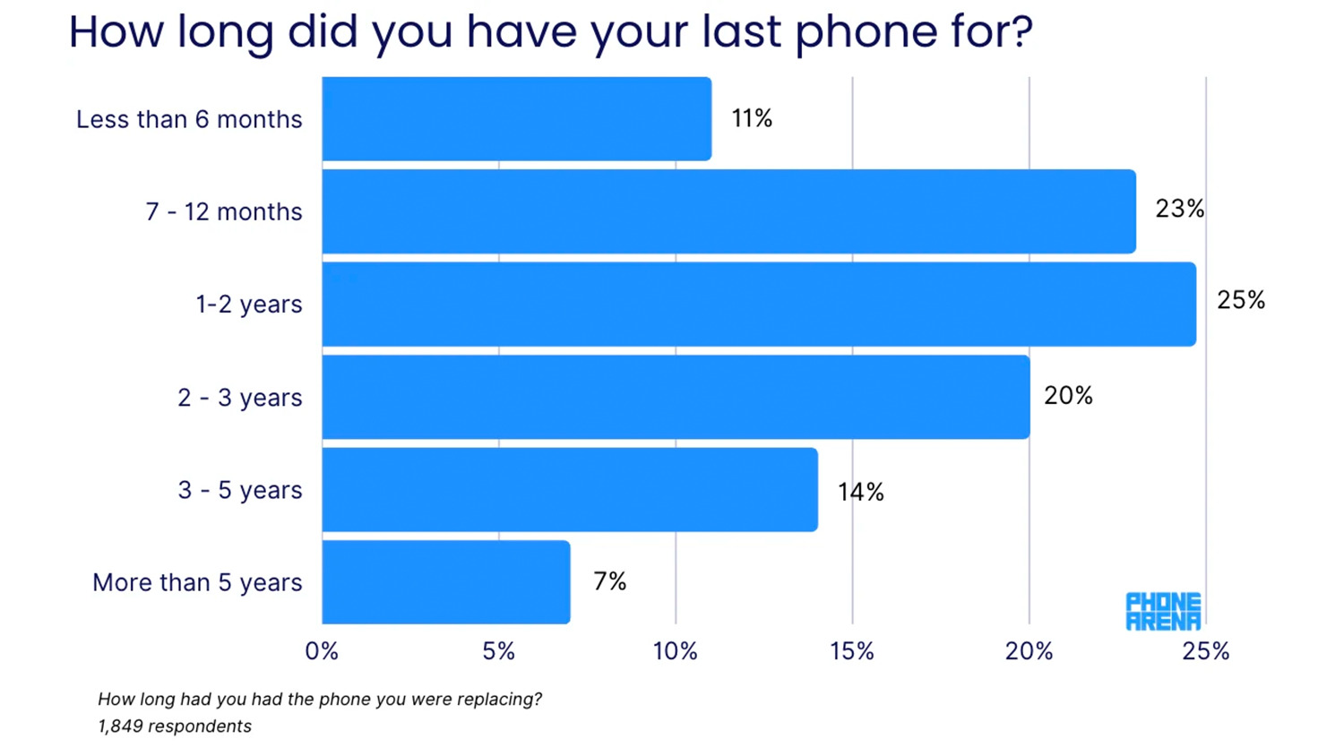 逆に5年以上使う人は全体の7%であることを確認できます。今回の調査結果からも平均機種変更サイクルは25ヶ月と言われており、日本市場と比較すると約半分という感じです。