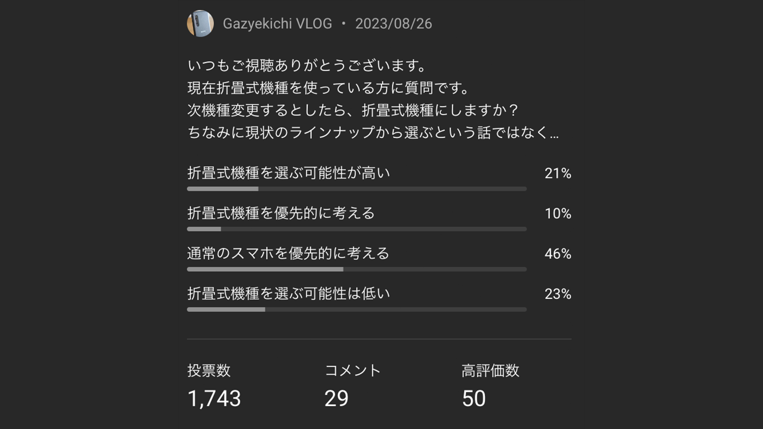 具体的な機種とか関係なく、現在折畳式機種を使用しているユーザーに、次も折畳式機種を選ぶのか?という内容で自分のYouTubeのコミュニティの方でアンケートを実施してみました。