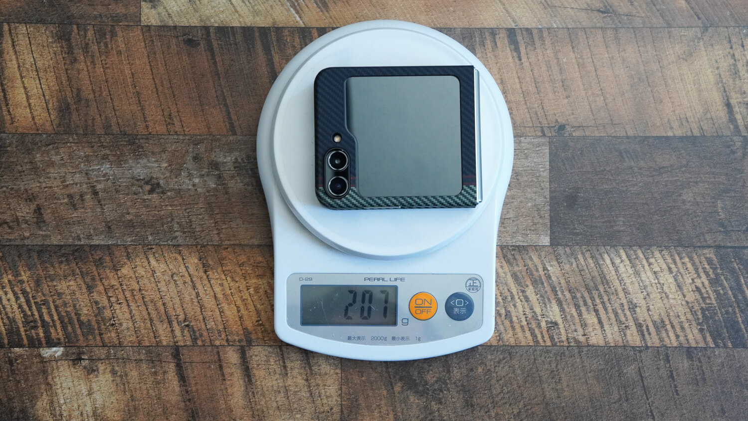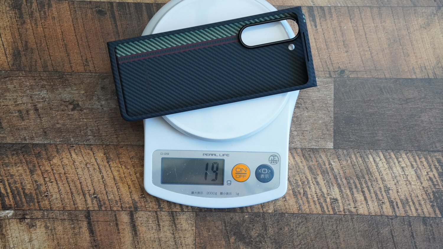 とりあえずケース単体で重さを測ったところ19gとなっておりかなり軽い方だと思います。そしてサブディスプレイにSpigenのガラスフィルムを装着済みで本体と合わせて計測。
