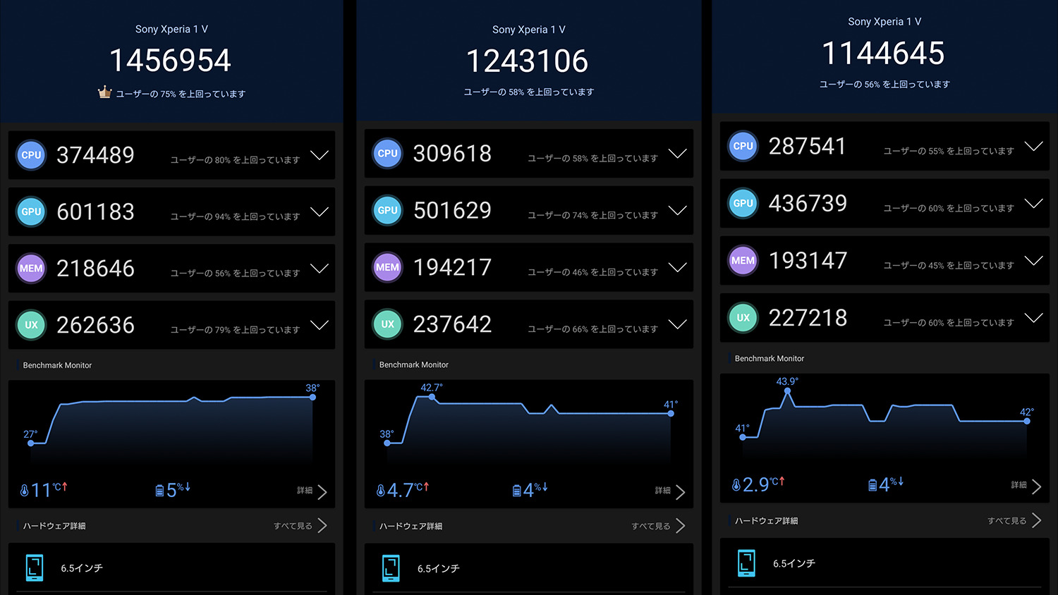 Xperia 5Ⅴは排熱が苦手なのかスロットルダウンがきつめにかかるため不安定になりがち。ちなみに計測終了後に外部温度を計測しましたがXperia 1Ⅴは36.8/38.6/40.2度でXperia 5Ⅴは35.4/37.2/38.2度とやはりXperia 5Ⅴの方がちょいマシです。