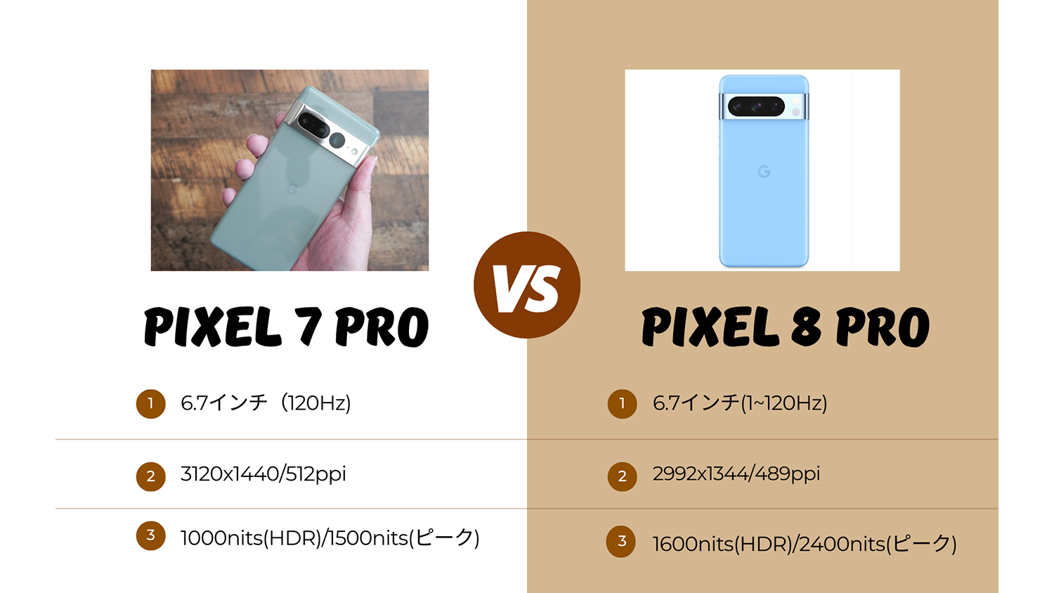 次にPixel 8 Proを確認するとPixel 8と異なりより強化されたSuper Actua Displayを搭載。ディスプレイサイズは現行モデルと一緒ですがディスプレイ輝度が大幅に強化されます。