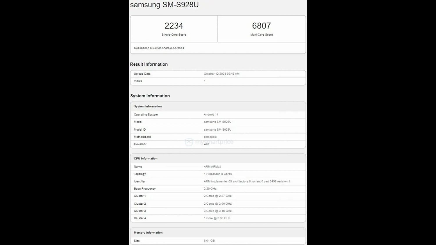 ベンチマークから確認できるコア数からもSnapdragon 8 Gen 3である可能性が高いと思います。またスコアはどの程度参考になるのか不明で一応確認するとシングルコアは2234でマルチコアは6807という感じ。