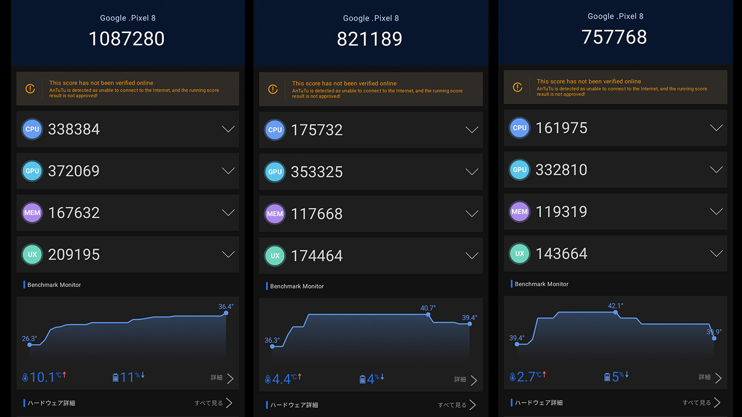 計測終了後に外部温度を計測してみましたがPixel 8は34.6/36.0/37.2度に対してXperia 5Ⅴは32.0/35.4/35.7度とXperia 5Ⅴの方が全体的に低いという感じです。あと発熱の感じ方としてXperia 5Ⅴの方がサイドフレームが熱くなるので不快に感じるかも。