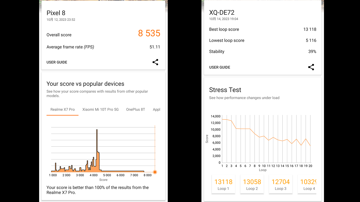 さらに3D Mark Wild Life Testを試してみましたがPixel 8は何回やっても失敗。開封直後に試した時は出来ましたがそれ以降はなぜかテスト途中で終了になります。一方でXperia 5Ⅴの安定率は39%と自分が試すようになってからは一番ひどいです。