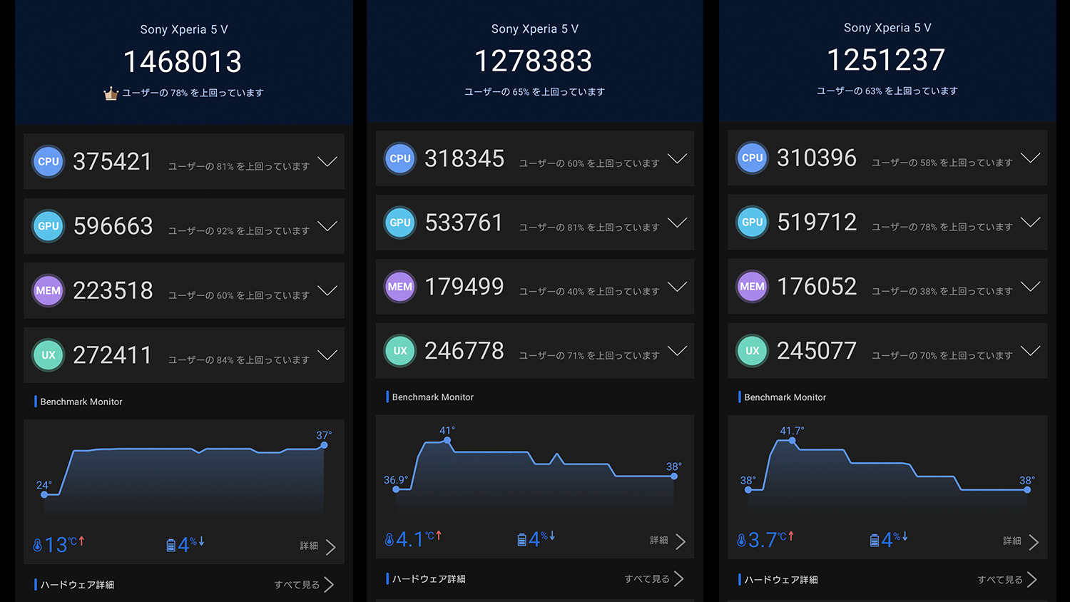 そして発熱の程度を調べるためにベンチマークを3回連続で回してみました。今回ベンチマークを回した時Xperia 5Ⅴは調子が良かったのか初めて145万点オーバーに。