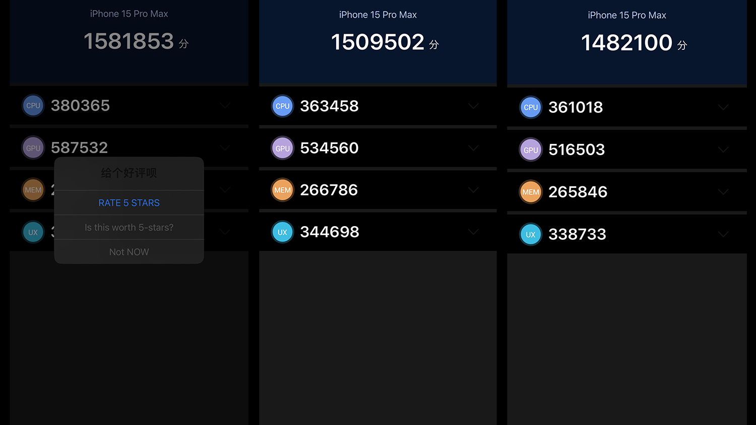 そして発熱の程度を調べるためにベンチマークを3回連続でまわしてみました。計測条件が一緒なのかスコアを比較することに正直意味がないと思っており逆にスコアがどれだけ安定したかの方が重要でiPhone 15 Pro Maxは10万程度しか落ちていない。
