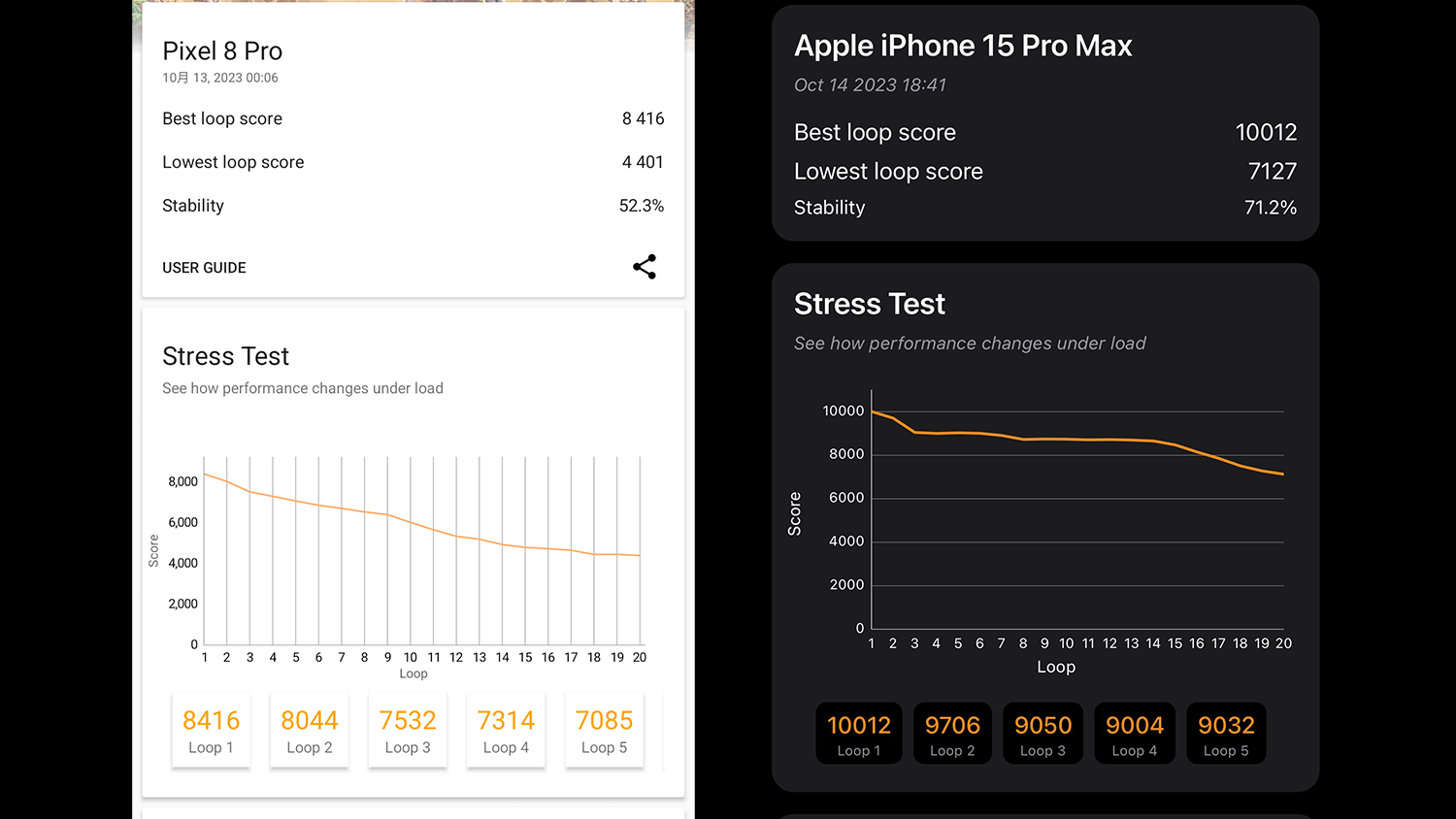 また合わせて3D Mark Wild Life Stress TestもしてみましたがPixel 8 Proは52.3%でiPhone 15 Pro Maxは71.2%なので安定率で見ると20%近くの差があるという感じです。