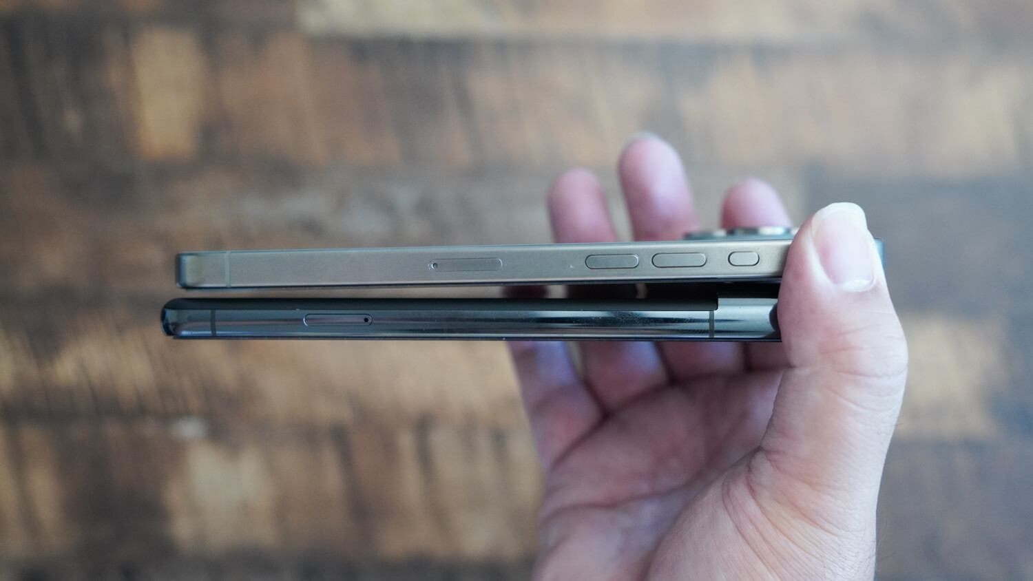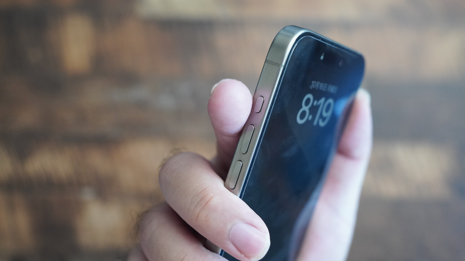 サイドフレームを確認するとiPhone 15 Pro Maxはフラットデザインを採用しつつも角に丸みを持たせたため前モデルのように片手で持った時に手に刺さるような感じはありません。