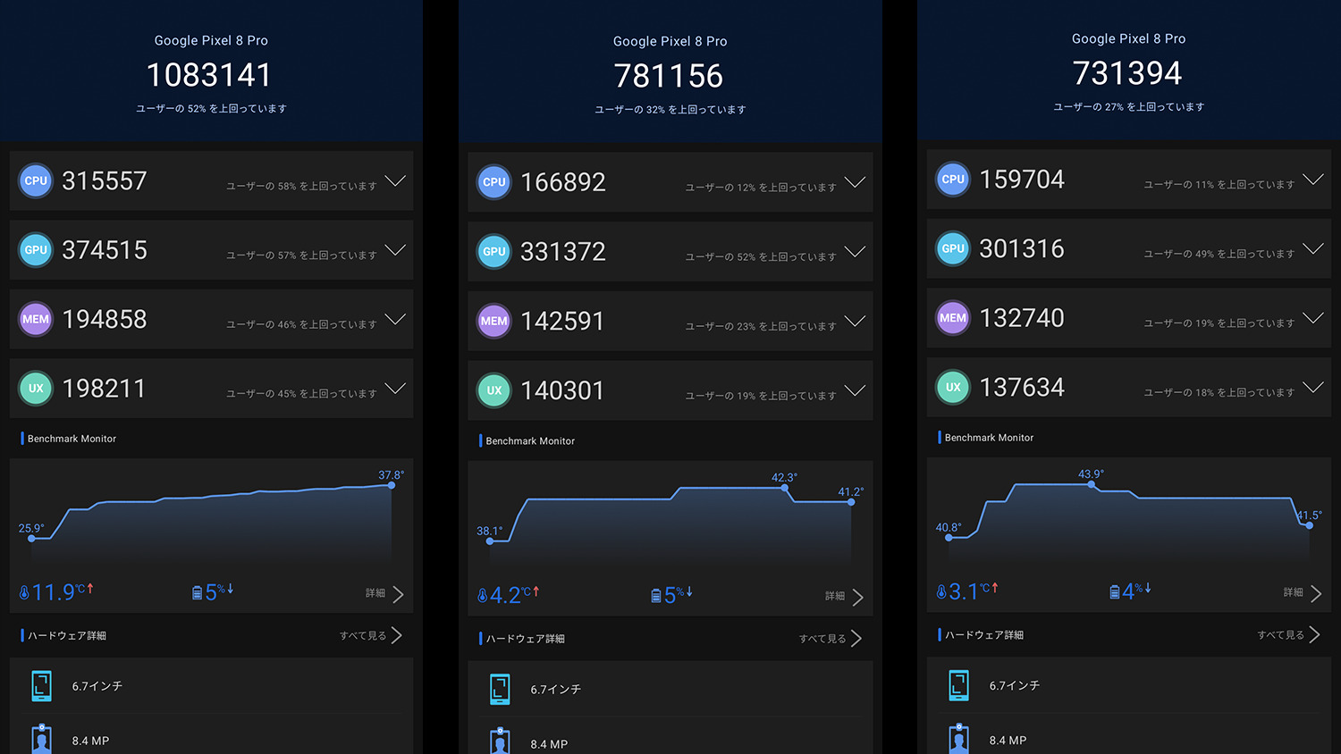 一方でPixel 8 Proは30万点近くおちているのでスロットルダウンの影響の可能性。ちなみに計測終了時点で外部温度を計測してみましたがiPhone 15 Pro Maxは33.0/36.5/36.8度に対してPixel 8 Proは35.3/37.4/38.1度と温度が高いです。